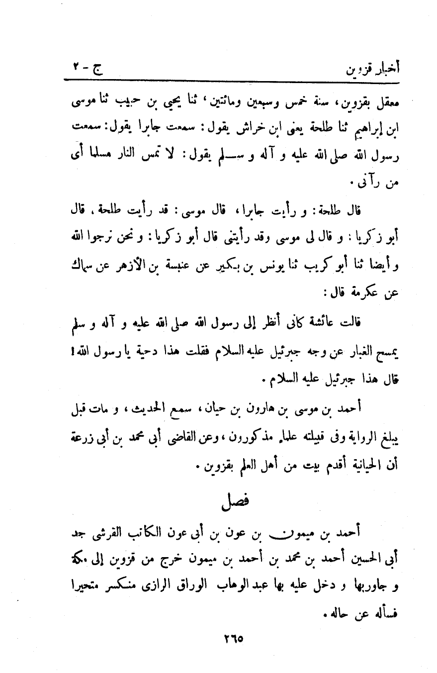 مَعْقِلٍ بِقَزْوِينَ سَنَةَ خَمْسٍ وَسَبْعِينَ وَمِائَتَيْنِ ثنا يَحْيَى بْنُ حَبِيبٍ ثنا موسى ابن إبراهيم ثنا طَلْحَةُ يَعْنِي ابْنَ خِرَاشٍ يَقُولُ سَمِعْتُ جَابِرًا يَقُولُ سَمِعْتُ رَسُولَ اللَّهِ صَلَّى اللَّهُ عليه وآله وَسَلَّمَ يَقُولُ: "لا تَمَسُّ النَّارُ مُسْلِمًا" أَيْ مَنْ رَآنِي.