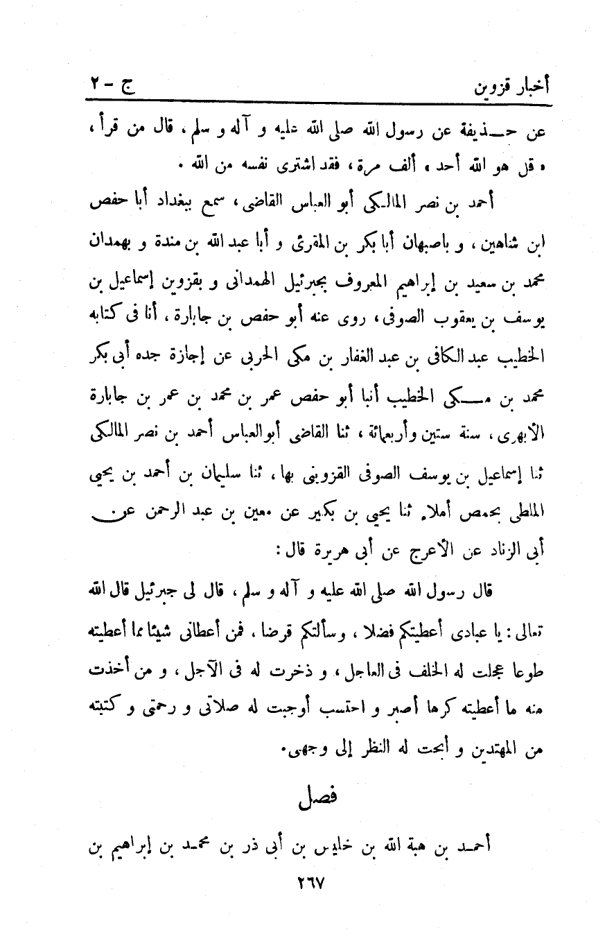 أَحْمَد بْن نصر المالكي أَبُو الْعَبَّاس القاضي سمع ببغداد أبا حفص ابن شاهين وبأصبهان أبا بكر بْن المقرىء وأبا عَبْد اللَّهِ بْن مَنْدَهْ وبهمدان مُحَمَّد بْن سعيد بْن إبراهيم المعروف بجبرئيل الهمداني وبقزوين إِسْمَاعِيل بْن يوسف بْن يعقوب الصوفي رَوَى عَنْهُ أَبُو حَفْصِ بْنُ جَابَارَةَ أنا فِي كِتَابِهِ الْخَطِيبُ عَبْدُ الْكَافِي بْنُ عَبْدِ الْغَفَّارِ بْنِ مَكِّيٍّ الْحَرْبِيُّ عَنْ إِجَازَةِ جَدِّهِ أَبِي بَكْرٍ مُحَمَّدِ بْنِ مَكِّيٍّ الْخَطِيبِ أَنْبَأَ أَبُو حَفْصٍ عُمَرُ بْنُ مُحَمَّدِ بْنِ عُمَرَ بْنِ جَابَارَةَ الأَبْهَرِيُّ سَنَةَ ستين وأربعمائة ثنا الْقَاضِي أَبُو الْعَبَّاسِ أَحْمَدُ بْنُ نَصْرٍ الْمَالِكِيُّ ثنا إِسْمَاعِيلُ بْنُ يُوسُفَ الصُّوفِيُّ الْقَزْوِينِيُّ بِهَا ثنا سُلَيْمَانُ بْنُ أَحْمَد بْنِ يَحْيَى الْمَلْطِيُّ بِحِمْصَ إِمْلاءً ثنا يَحْيَى بْنُ بُكَيْرٍ عَنْ مَعِينِ بْنُ عَبْدِ الرَّحْمَنِ عَنْ أَبِي الزِّنَادِ عَنِ الأَعْرَجِ عَنْ أَبِي هُرَيْرَةَ قَالَ: