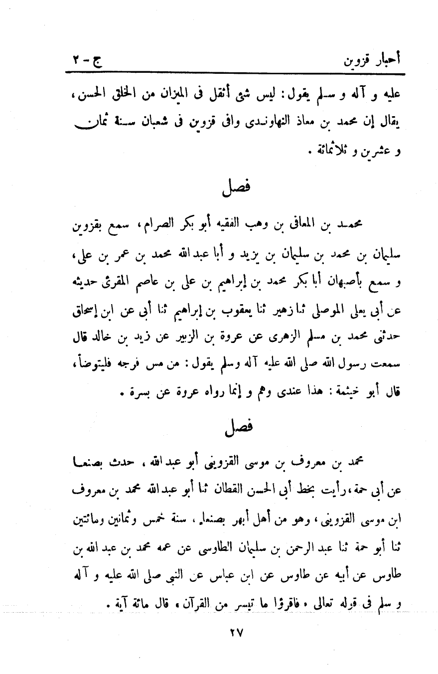 مُحَمَّدُ بْنُ مَعْرُوفِ بْنِ مُوسَى الْقَزْوِينِيُّ أَبُو عَبْدِ اللَّهِ حَدَّثَ بصنعا عَنْ أَبِي حُمَةَ رَأَيْتُ بِخَطِّ أَبِي الْحَسَنِ الْقَطَّانِ ثَنَا أَبُو عَبْدِ اللَّهِ مُحَمَّدُ بْنُ مَعْرُوفِ ابن مُوسَى الْقَزْوِينِيُّ وَهُوَ مِنْ أَهْلِ أَبْهَرَ بِصَنْعَاءَ سَنَةَ خَمْسٍ وَثَمَانِينَ وَمِائَتَيْنِ ثنا أَبُو حُمَةَ ثنا عَبْدُ الرَّحْمَنِ بْنُ سُلَيْمَانَ الطَّاوُسِيُّ عَنْ عَمِّهِ مُحَمَّدِ بْنِ عَبْدِ اللَّهِ بْنِ طَاوُسٍ عَنْ أَبِيهِ عَنْ طَاوُسٍ عَنِ ابْنِ عَبَّاسٍ عَنِ النَّبِيِّ صَلَّى اللَّهُ عَلَيْهِ وآله وسلم صَلَّى اللَّهُ عَلَيْهِ وَآلِهِ وَسَلَّمَ في قوله تعالى: {فَاقْرَأُوا مَا تَيَسَّرَ مِنَ الْقُرْآنِ} قال مائة آية