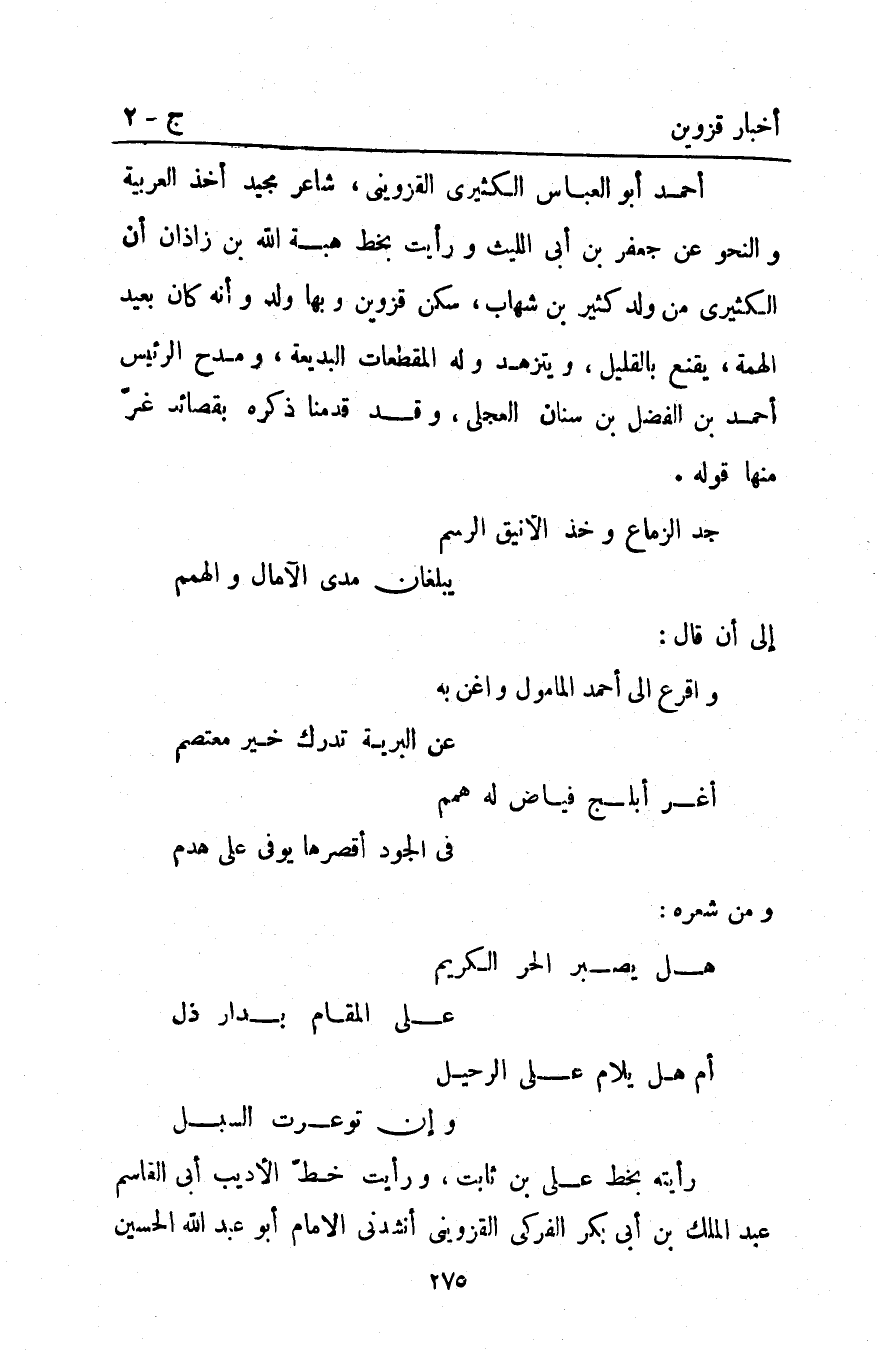 رأيته بخط علي بْن ثابت ورأيت خط الأديب أبي القاسم عَبْد الملك بْن أبي بكر الفركي القزويني أنشدني الإمام أبو عبد الله الحسين