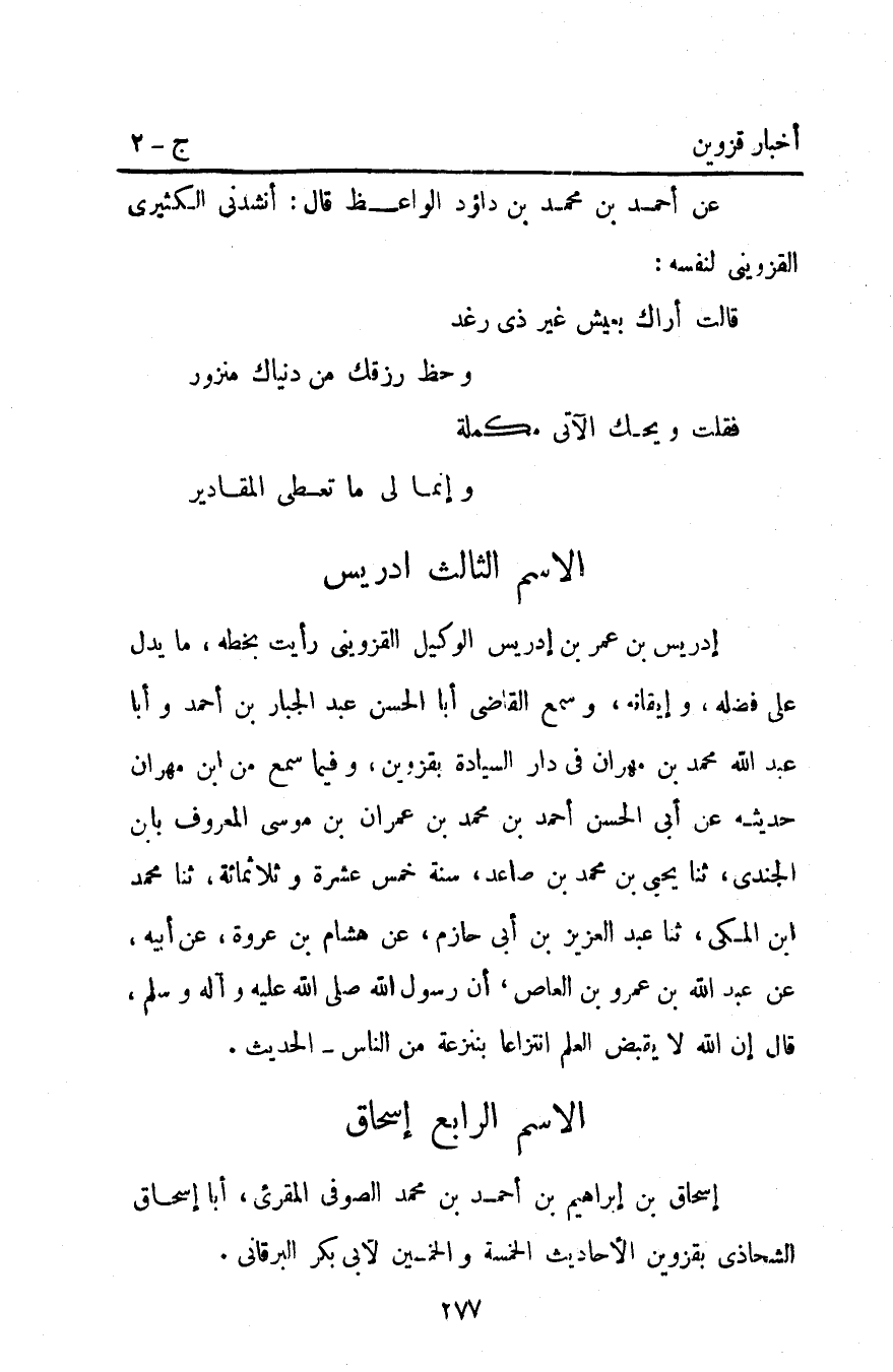 إدريس بْن عمر بْن إدريس الوكيل الْقَزْوِينِيّ رأيت بخطه ما يدل عَلَى فضله وإيقانه وسمع القاضي أبا الحسن عَبْد الجبار بْن أَحْمَد وأبا عَبْد اللَّهِ مُحَمَّد بْن مهران فِي دار السيادة بِقَزْوِينَ وَفِيمَا سَمِعَ مِنَ ابْنِ مِهْرَانَ حَدِيثَهُ عَنْ أَبِي الْحَسَنِ أَحْمَدُ بْنُ مُحَمَّدِ بْنِ عِمْرَانَ بْنِ مُوسَى الْمَعْرُوفِ بِابْنِ الْجُنْدِيِّ ثَنَا يَحْيَى بْنُ مُحَمَّدِ بْنِ صاعد سنة خمس عشرة وثلاثمائة ثنا محمد ابن الْمَكِّيِّ ثنا عَبْدُ الْعَزِيزِ بْنُ أَبِي حَازِمٍ عَنْ هِشَامِ بْنِ عُرْوَةَ عَنْ أَبِيهِ عَنْ عَبْدِ اللَّهِ بْنُ عَمْرِو بْنِ الْعَاصِ أن رسول اللَّه صَلَّى اللَّهُ عَلَيْهِ وَآلِهِ وَسَلَّمَ قَالَ: "إِنَّ اللَّهَ لا يَقْبِضُ الْعِلْمَ انْتِزَاعًا بنزعة من الناس" الحديث.