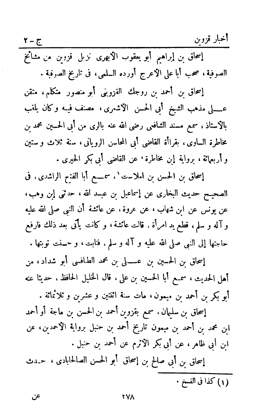 إسحاق بْن سليمان سمع بِقَزْوِينَ أَحْمَد بْن الحسن بْن ماجة أو أحمد ابن مُحَمَّدُ بْنُ أَحْمَدَ بْنِ مَيْمُونٍ تاريخ أَحْمَد بْن حنبل برواية الأحمدين عن ابن أبي ظاهر عن أبي بكر الأثرم عن أَحْمَد بْن حنبل.