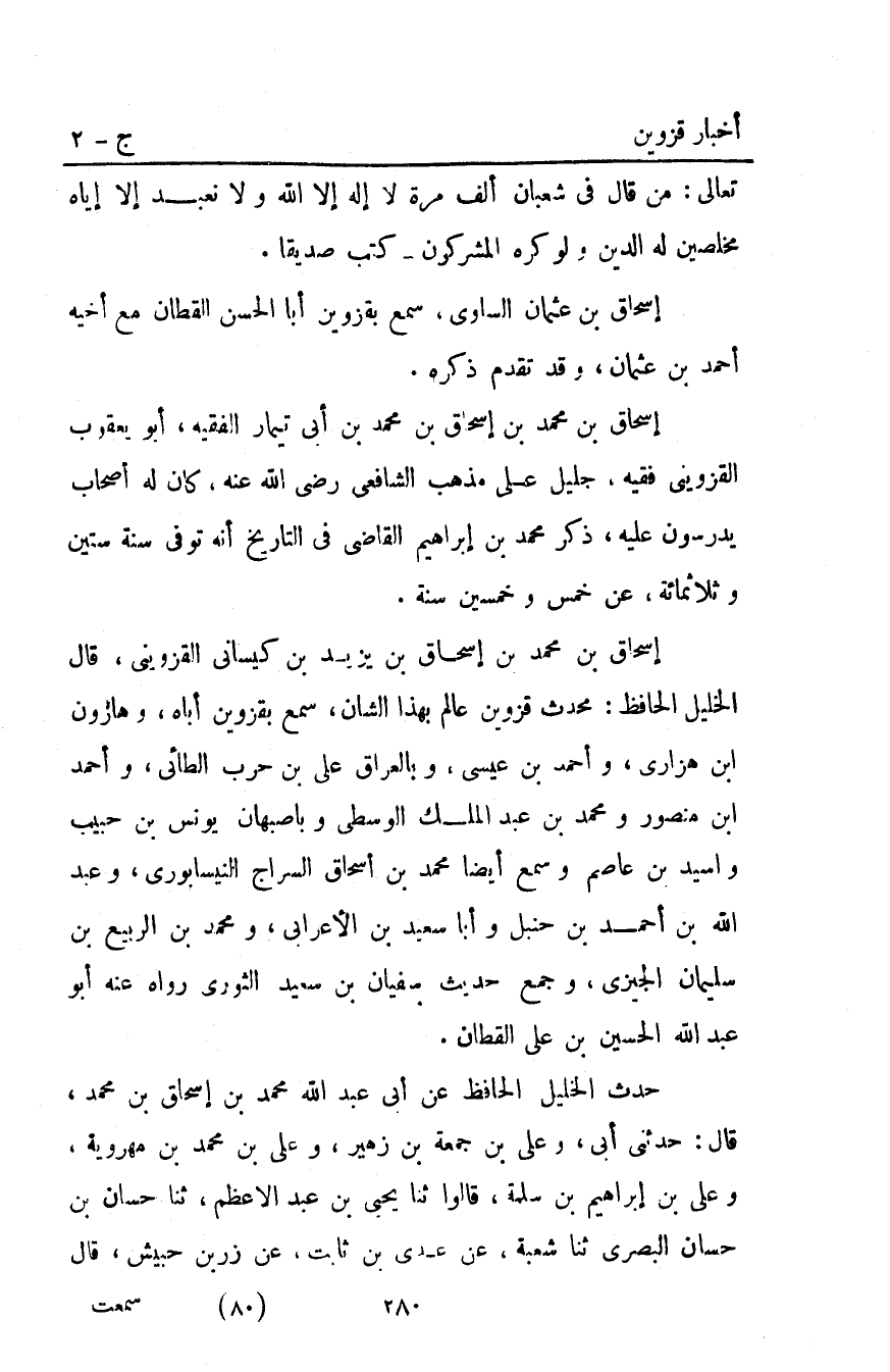 إسحاق بْن مُحَمَّد بْن إسحاق بْن يزيد بْن كيساني الْقَزْوِينِيّ قَالَ الخليل الحافظ محدث قزوين عالم بهذا الشأن سمع بِقَزْوِينَ أباه وهارون ابن هزاري وأحمد بْن عِيسَى وبالعراق علي بْن حرب الطائي وأحمد ابن منصور ومحمد بْن عَبْدِ الملك الوسطي وبأصبهان يونس بْن حبيب واسيد بْن عاصم وسمع أيضا مُحَمَّد بْن إسحاق السراج النيسابوري وعَبْد اللَّه بْن أَحْمَدَ بْن حنبل وأبا سعيد بْن الأعرابي ومحمد بْن الربيع بْن سليمان الجيزي وجمع حديث سفيان بْن سعيد الثوري رواه عَنْهُ أَبُو عبد االله الحسين بْن علي القطان.