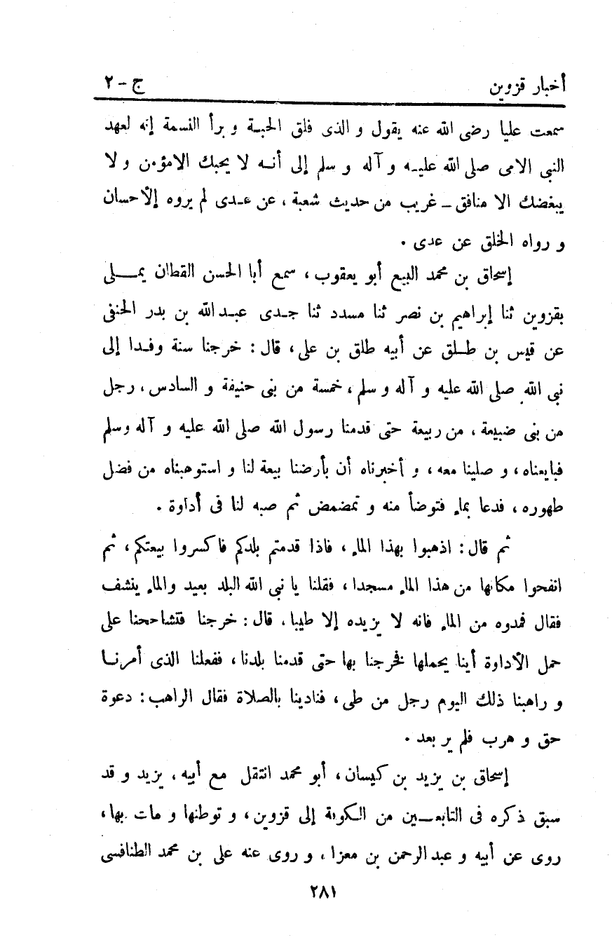 إسحاق بْنُ مُحَمَّدٍ الْبَيِّعُ أَبُو يَعْقُوبَ سَمِعَ أَبَا الْحَسَنِ الْقَطَّانَ يُمْلِي بِقَزْوِينَ ثنا إبراهيم بْنُ نَصْرٍ ثنا مُسَدَّدٌ ثنا جَدِّي عَبْدُ اللَّهِ بْنُ بَدْرٍ الْحَنَفِيُّ عَنْ قَيْسِ بْنِ طَلْقٍ عَنْ أَبِيهِ طَلْقِ بْنِ عَلِيٍّ قَالَ خَرَجْنَا سنة وفدا إِلَى نَبِيِّ اللَّهِ صَلَّى اللَّهُ عليه وآله وَسَلَّمَ خَمْسَةٌ مِنْ بَنِي حَنِيفَةَ وَالسَّادِسُ رَجُلٌ مِنْ بَنِي ضُبَيْعَةَ مِنْ رَبِيعَةَ حَتَّى قَدِمْنَا رَسُولَ اللَّهِ صَلَّى اللَّهُ عَلَيْهِ وَآلِهِ وَسَلَّمَ فَبَايَعْنَاهُ وَصَلَّيْنَا مَعَهُ وَأَخْبَرْنَاهُ أَنَّ بِأَرْضِنَا بَيْعَةً لَنَا وَاسْتَوْهَبْنَاهُ مِنْ فَضْلِ طُهُورِهِ فَدَعَا بِمَاءٍ فَتَوَضَّأَ مِنْهُ وَتَمَضْمَضَ ثُمَّ صَبَّهُ لَنَا فِي إِدَاوَةٍ.