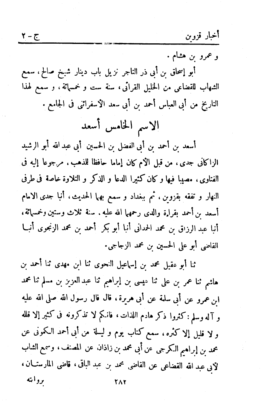 ثنا أَبُو عُقَيْلٍ مُحَمَّدُ بْنُ إِسْمَاعِيلَ النَّحْوِيُّ ثنا ابْنُ مَهْدِيٍّ ثنا أَحْمَد بْنُ هَاشِمٍ ثنا عُمَرُ بْنُ عَلِيٍّ ثنا عِيسَى بْنُ إبراهيم ثنا عَبْدُ الْعَزِيزِ بْنُ مُسْلِمٍ ثنا مُحَمَّدُ ابن عَمْرٍو عَنْ أَبِي سَلَمَةَ عَنْ أَبِي هُرَيْرَةَ قَالَ: قَالَ رَسُولُ اللَّهِ صَلَّى اللَّهُ عَلَيْهِ وَآلِهِ وَسَلَّمَ: "كَثِّرُوا ذِكْرَ هَادِمِ اللَّذَّاتِ فَإِنَّكُمْ لا تَذْكُرُونَهُ فِي كَثِيرٍ إِلا قَلَّلَهُ وَلا قَلِيلٍ إِلا كَثَّرَهُ" سمع كتاب يوم وليلة من أبي أَحْمَد الكموني عَنْ مُحَمَّدِ بْنِ إبراهيم الكرجي عن أبي مُحَمَّد بْن زاذان عن المصنف وسمع الشاب لأبي عَبْد اللَّهِ القضاعي عن القاضي مُحَمَّد بْن عَبْدِ الباقي قاضي المارستان