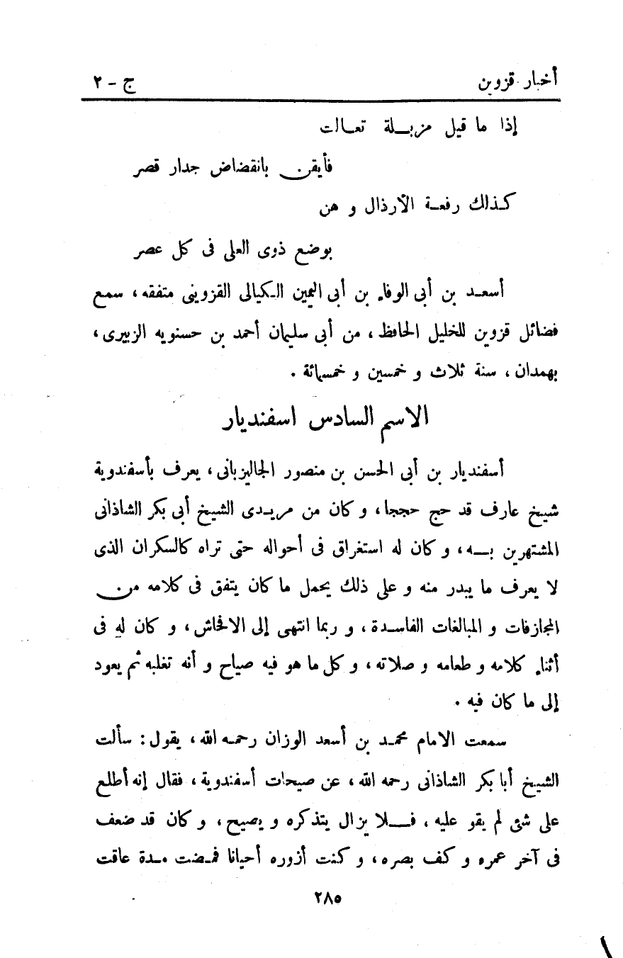 اسفنديار بْن أبي الحسن بْن منصور الجاليزباني يعرف بأسفندويه شيخ عارف قد حج حججا وكان من مريدي الشيخ أبي بكر الشاذاني المشتهرين به وكان له استغراق فِي أحواله حَتَّى تراه كالسكران الذي لا يعرف ما يبدر منه وعَلَى ذلك يحمل ما كَانَ يتفق فِي كلامه من المجازفات والمبالغات الفاسدة وربما انتهى إِلَى الأفحاش وكان له فِي أثناء كلامه وطعامه وصلاته وكل ما هو فيه صياح وأنه تغلبه ثم يعود إِلَى ما كَانَ فيه.