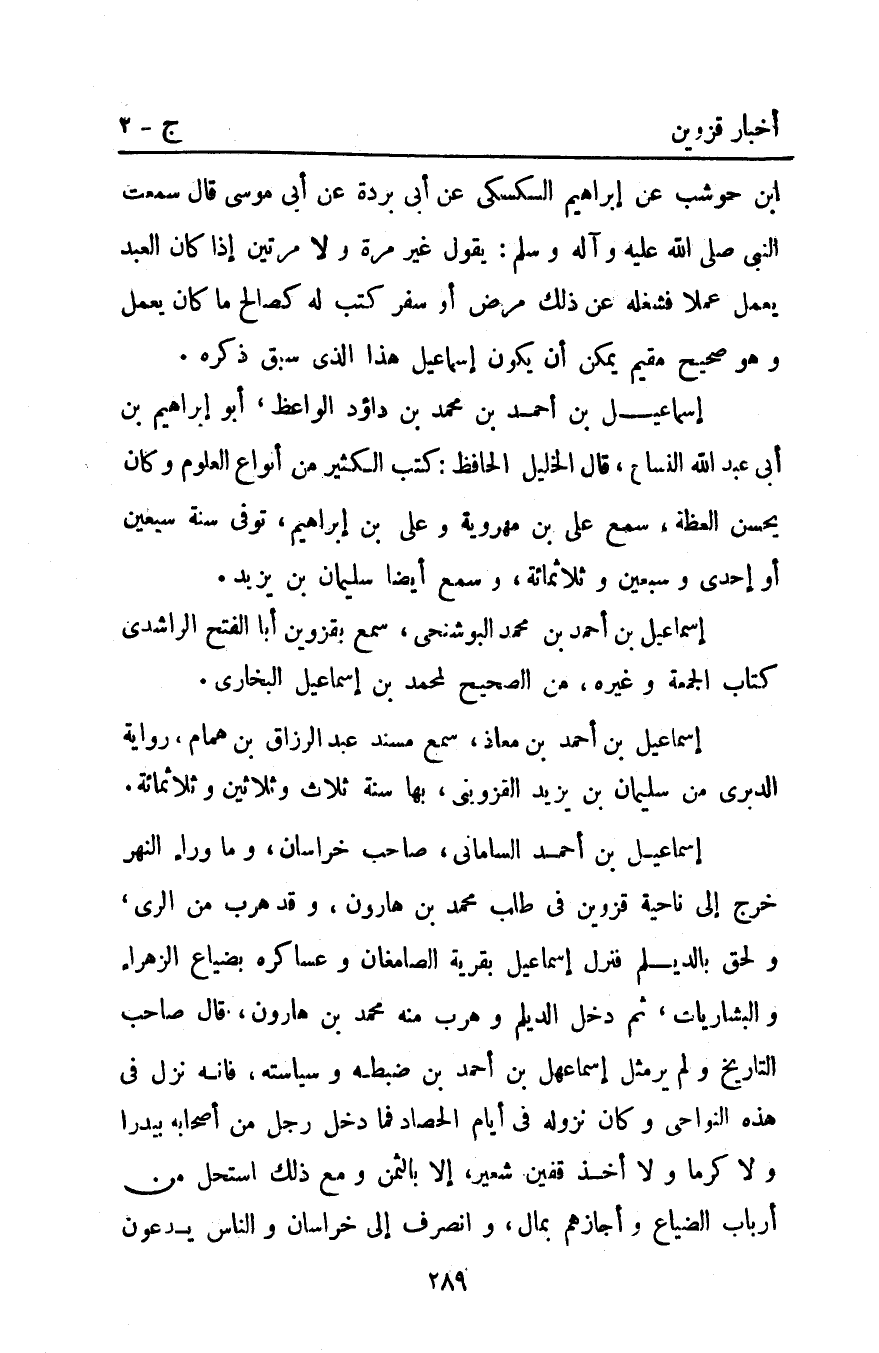 إِسْمَاعِيل بْن أَحْمَد الساماني صاحب خراسان وما وراء النهر خرج إِلَى ناحية قزوين فِي طلب مُحَمَّد بْن هارون وقد هرب من الري ولحق بالديلم فنزل إِسْمَاعِيل بقرية الصامغان وعساكره بضياع الزهراء والبشاريات ثم دخل الديلم وهرب منه مُحَمَّد بْن هارون قَالَ صاحب التاريخ ولم ير مثل إِسْمَاعِيل بْن أَحْمَد بْن ضبطه وسياسته فإنه نزل فِي هَذِهِ النواحي وكان نزوله فِي أيام الحصاد فما دخل رجل من أصحابه بيدرا ولا كرما ولا أخذ قفين شعير إلا بالثمن ومع ذلك استحل من أرباب الضياع وأجازهم بمال وانصرف إِلَى خراسان والناس يدعون