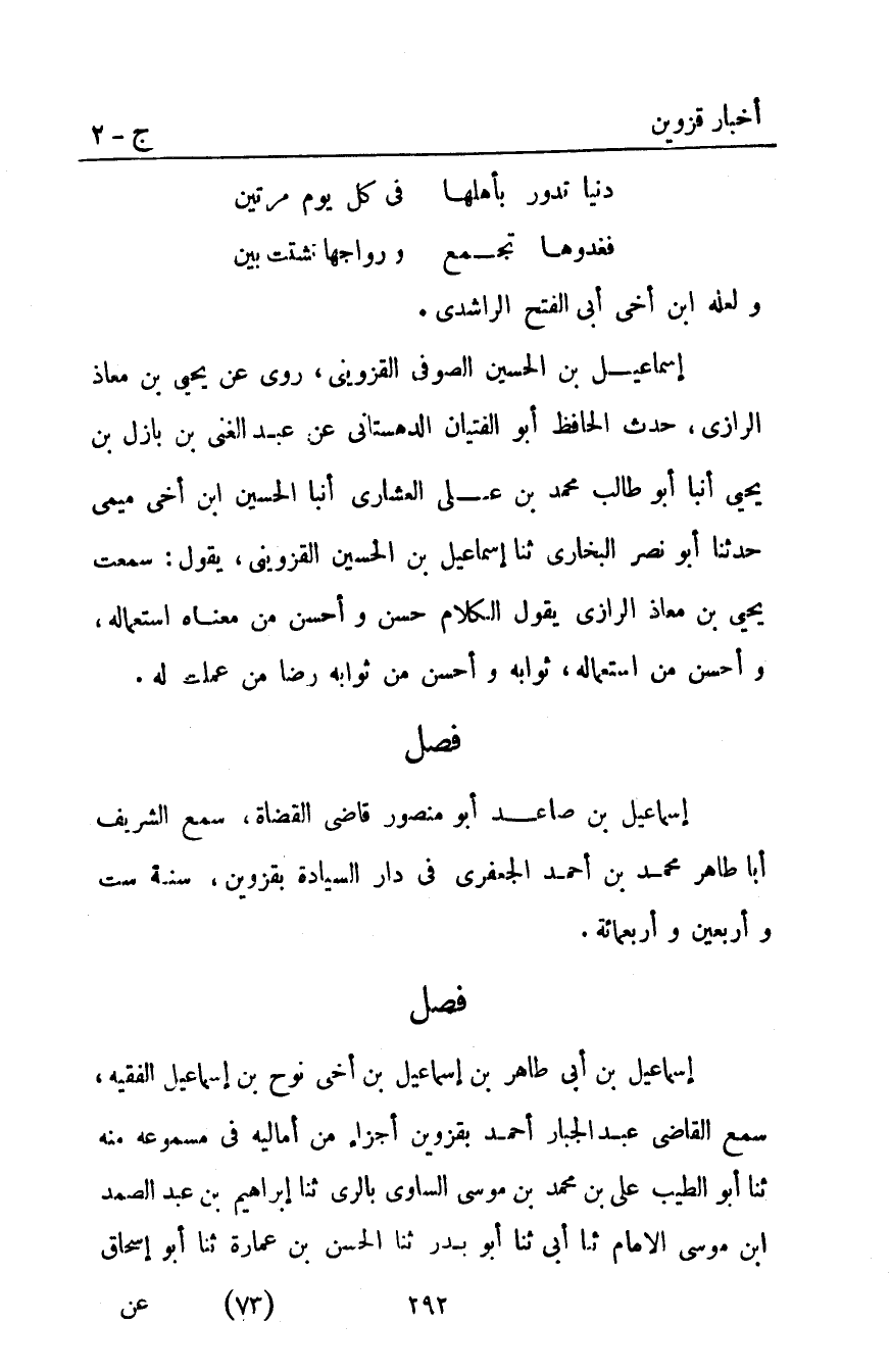إسماعيل بْنُ أَبِي طَاهِرِ بْنِ إِسْمَاعِيلَ بْنِ أَخِي نُوحِ بْنِ إِسْمَاعِيلَ الفقيه سمع القاضي عَبْد الجبار أَحْمَد بِقَزْوِينَ أَجْزَاءً مِنْ أَمَالِيهِ فِي مَسْمُوعِهِ مِنْهُ ثنا أَبُو الطَّيِّبِ عَلِيُّ بْنُ مُحَمَّدِ بْنِ مُوسَى السَّاوِيُّ بِالرَّيِّ ثنا إبراهيم بن عبد الصمد ابن مُوسَى الإِمَامُ ثنا أَبِي ثنا أَبُو بَدْرٍ ثنا الْحَسَنُ بْنُ عمارة ثنا أبو إسحاق