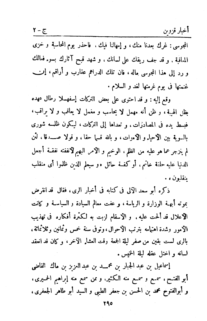 المجوسي: غرك بعدنا منك وإمهالنا فيك فاحذر يوم المحاسبة وخزي المعاقبة وقد جف ريقك عَلَى لسانك وشهد قبح آثارك بسوء فعالك ورد إِلَى هذا المجوسي ماله فإن تلك الدراهم عقارب وأراقم إن غنمتها فِي يوم غرمتها لغد والسلام.