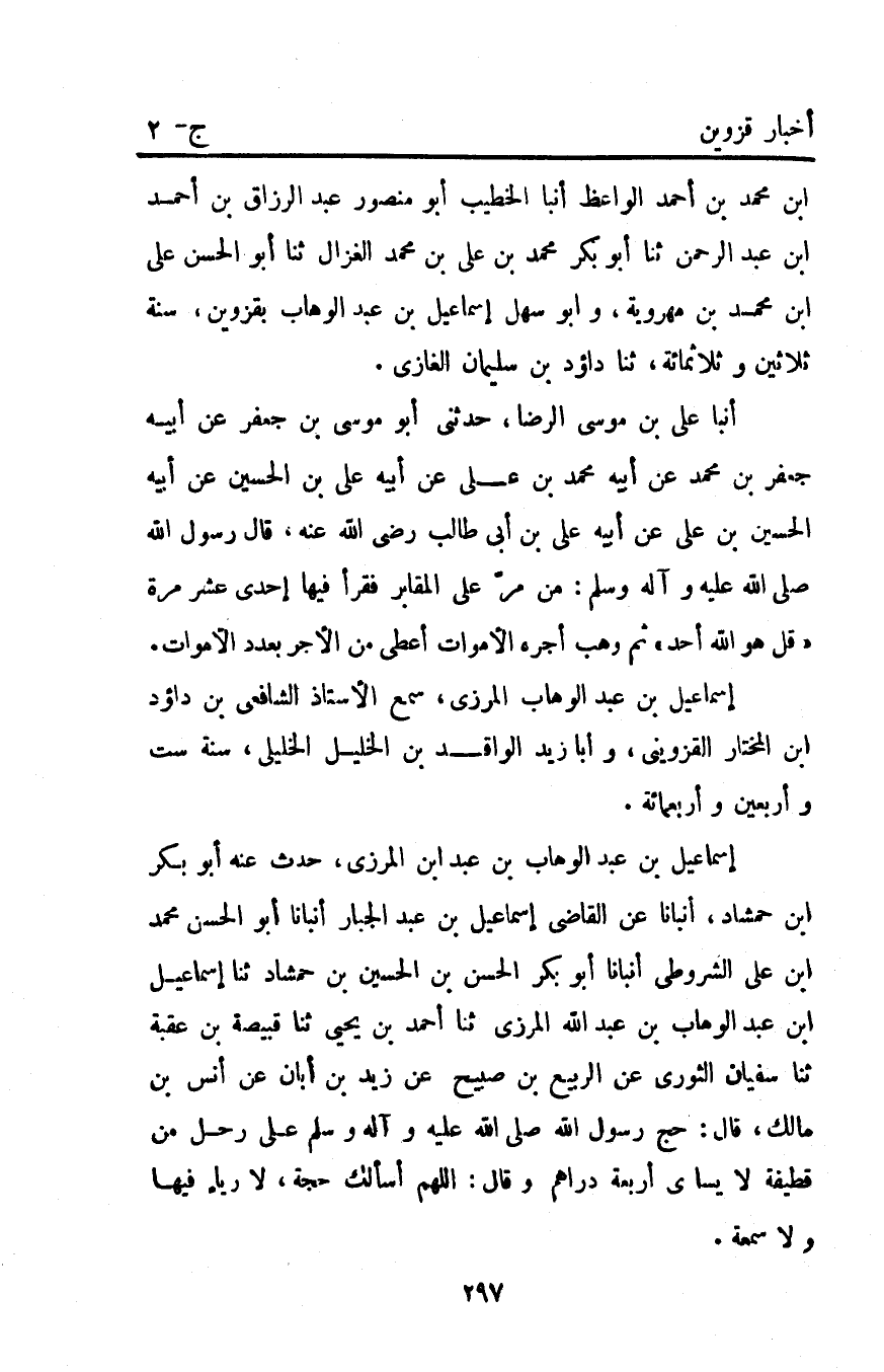 أَنْبَأَ عَلِيُّ بْنُ مُوسَى الرِّضَا حَدَّثَنِي أَبُو مُوسَى بْنِ جَعْفَرٍ عَنْ أَبِيهِ جَعْفَرَ بْنَ مُحَمَّدٍ عَنْ أَبِيهِ مُحَمَّدِ بْنِ عَلِيٍّ عَنْ أَبِيهِ عَلِيِّ بْنِ الْحُسَيْنِ عَنْ أَبِيهِ الْحُسَيْنِ بْنِ عَلِيّ عَنْ أَبِيهِ عَلِيِّ بْنِ أَبِي طَالِبٍ رَضِيَ اللَّهُ عَنْهُ قَالَ رَسُولُ اللَّهِ صَلَّى اللَّهُ عَلَيْهِ وَآلِهِ وَسَلَّمَ: "مَنْ مَرَّ عَلَى الْمَقَابِرِ فَقَرَأَ فِيهَا إِحْدَى عَشَرَ مَرَّةٍ قُلْ هُوَ اللَّهُ أَحَدٌ ثُمَّ وَهَبَ أَجْرَهُ الأَمْوَاتَ أُعْطِيَ مِنَ الأَجْرِ بِعَدَدِ الأَمْوَاتِ". إِسْمَاعِيل بْن عَبْدِ الوهاب المرزي سمع الأستاذ الشافعي بن داؤد ابن المختار الْقَزْوِينِيّ وأبا زيد الواقد بْن الخليل الخليلي سنة ست وأربعين وأربعمائة.