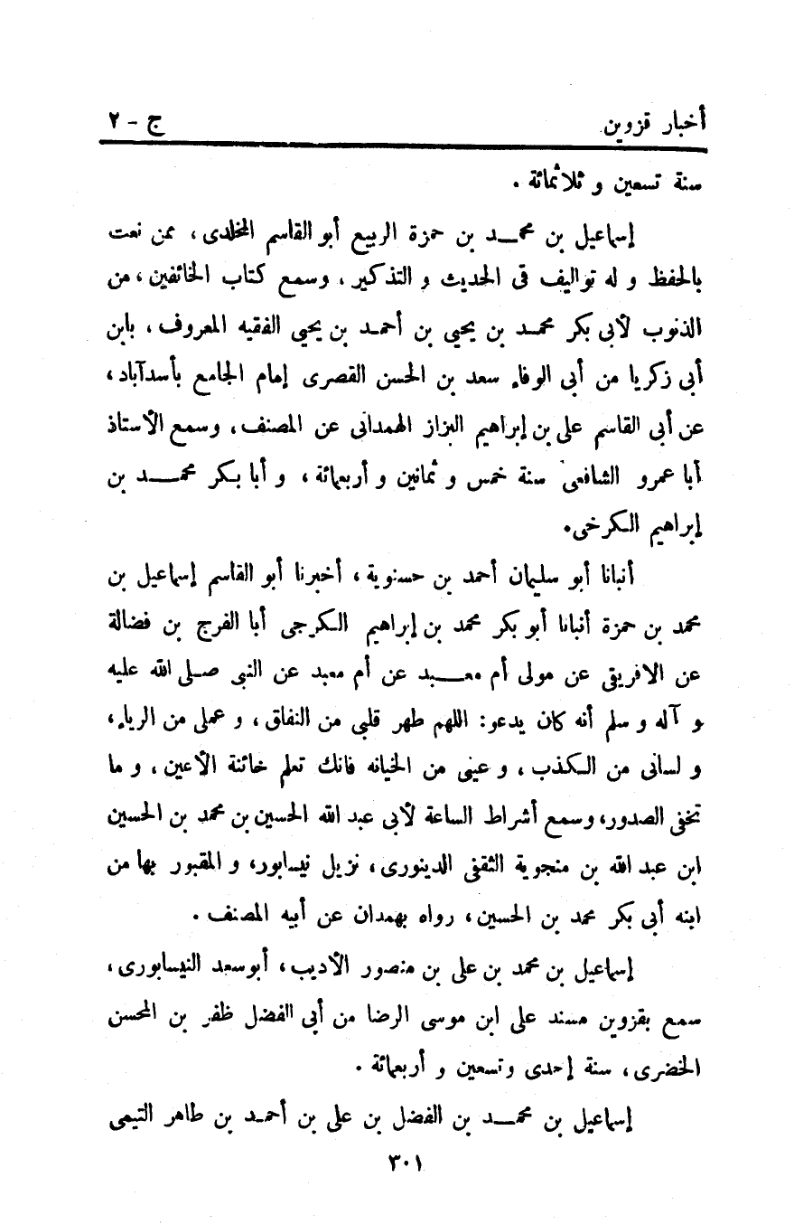 إسماعيل بْنُ مُحَمَّدِ بْنِ عَلِيِّ بْنِ منصور الأديب أَبُو سعد النيسابوري سمع بقزوين مسند علي ابن مُوسَى الرضا من أبي الفضل ظفر بْن المحسن الخضري سنة إحدى وتسعين وأربعمائة.