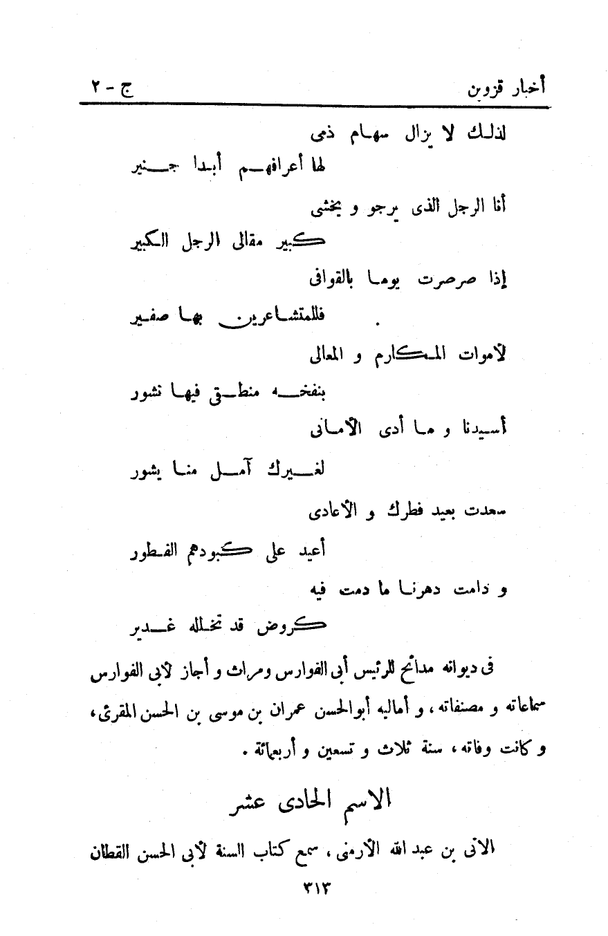فِي ديوانه مدائح للرئيس أبي الفوارس ومراث وأجاز لأبي الفوارس سماعاته ومصنفاته وأماليه أَبُو الحسن عمران بْن مُوسَى بْن الحسن المقرئ وكانت وفاته سنة ثلاث وتسعين وأربعمائة.