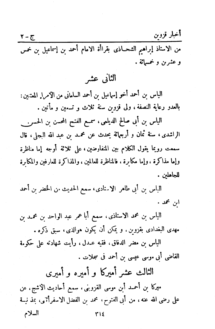 أميركا بن أحمد أبن مُوسَى الْقَزْوِينِيُّ سَمِعَ أَحَادِيثَ الأَشَجِّ عَنْ عَلِيٍّ رَضِيَ اللَّهُ عَنْهُ من أبي الفتوح مُحَمَّد بْن الفضل الاسفرأثني بمذنبه