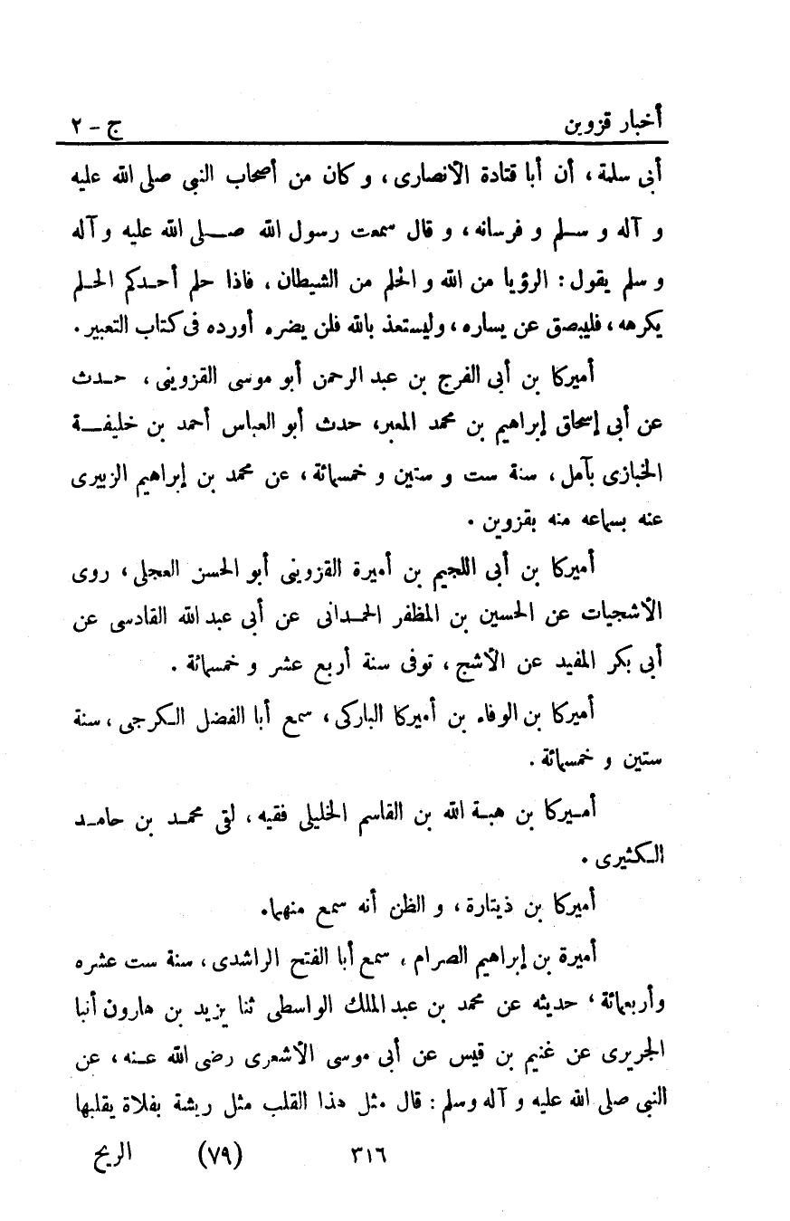 أَمِيرَةُ بْنُ إبراهيم الصَّرَّامُ سَمِعَ أَبَا الْفَتْحِ الرَّاشِدِيَّ سَنَةَ سِتَّ عَشْرَةَ وأربعمائة حديثه عن مُحَمَّد بْن عبد الْمَلِكِ الْوَاسِطِيُّ ثَنَا يَزِيدُ بْنُ هَارُونَ أَنْبَأَ الْجُرَيْرِيُّ عَنْ غُنَيْمِ بْنِ قَيْسٍ عَنْ أَبِي مُوسَى الأشعري رضي اللَّه عنه عن النبي صَلَّى اللَّهُ عَلَيْهِ وَآلِهِ وَسَلَّمَ قَالَ: "مَثَلُ هَذَا الْقَلْبِ مَثَلُ ريشة بفلاة يقلبها