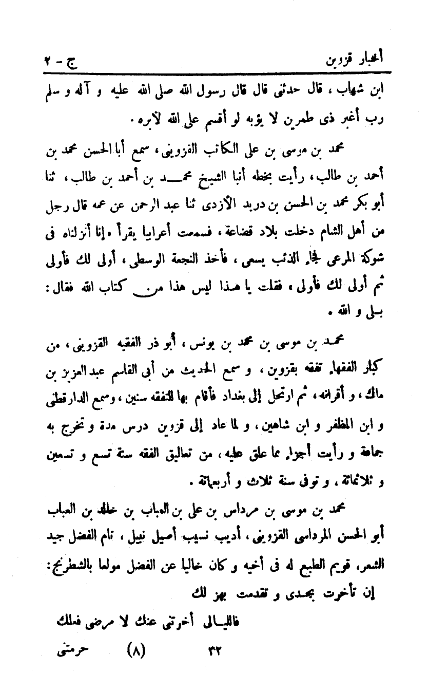 مُحَمَّد بْن مُوسَى بْن علي الكاتب الْقَزْوِينِيّ سمع أبا الحسن مُحَمَّد بْن أَحْمَد بْن طالب رأيت بخطه أنبأ الشيخ مُحَمَّد بْن أَحْمَد بْن طالب ثنا أَبُو بكر مُحَمَّد بْن الحسن بْن دريد الأزدي ثنا عَبْد الرَّحْمَنِ عن عمه قَالَ رجل من أهل الشام دخلت بلاد قضاعة فسمعت أعرابيا يقرأ إنا أنزلناه فِي شوكة المرعي فجاء الذئب يسعى فأخذ النعجعة الوسطى أولي لك فأولي ثم أولي لك فأولي فقلت يا هذا ليس هذا من كتاب اللَّه فقال بلى والله.