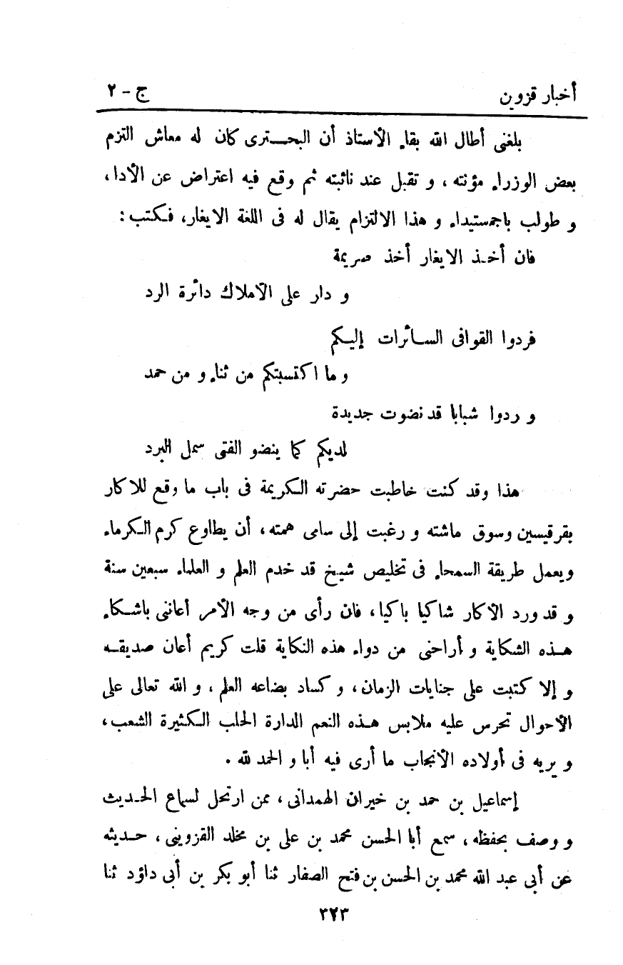 هذا وكنت خاطبت حضرته الكريمة فِي باب ما وقع للأكار بقرقيسين وسوق ماشته ورغبت إِلَى سامي همته أن يطاوع كرم الكرماء ويعمل طريقة السمحاء فِي تخليص شيخ قد خدم العلم والعلماء سبعين سنة وقد ورد الأكار شاكيا باكيا فإن رأي من وجه الأمر أعانني بإشكاء هَذِهِ الشكاية وأراحني من دواء هَذِهِ النكاية قلت كريم أعان صديقه وإلا كتبت عَلَى جنايات الزمان وكساد بضاعة العلم والله تعالى عَلَى الأحوال تحرس عليه ملابس هَذِهِ النعم الدارة الحلب الكثيرة الشعب ويريه فِي أولاده الأنجاب ما أري فيه أبا والحمد لله.