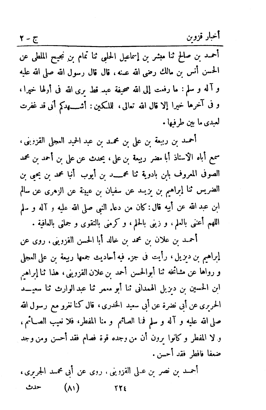 أَحْمَد بْن علان بْن مُحَمَّد بْن خالد أبا الحسن الْقَزْوِينِيّ روى عن إبراهيم بْن ديزيل رأيت فِي جزء فيه أحاديث جمعها ربيعة بْن علي العجلي ورواها عن مشائخه ثَنَا أَبُو الْحَسَنِ أَحْمَدُ بْنُ عَلانَ الْقَزْوِينِيُّ هَذَا ثنا إبراهيم ابن الحسيني ابن دِيزِيلَ الْهَمْدَانِيُّ ثنا أَبُو مَعْمَرٍ ثنا عَبْدُ الْوَارِثِ ثنا سَعِيدٌ الْحَرِيرِيُّ عَنْ أَبِي نَضْرَةَ عَنْ أَبِي سَعِيدٍ الْخُدْرِيِّ قَالَ كُنَّا نَغْزُو مَعَ رَسُولِ اللَّهِ صَلَّى الله عليه وآله وَسَلَّمَ فَمِنَّا الصَّائِمُ وَمِنَّا الْمُفْطِرُ فَلا نَعِيبُ الصَّائِمَ وَلا الْمُفْطِرَ وكانوا يرون أن من وجده قُوَّةً فَصَامَ فَقَدْ أَحْسَنَ وَمَنْ وَجَدَ ضَعْفًا فَأَفْطَرَ فَقَدْ أَحْسَنَ.