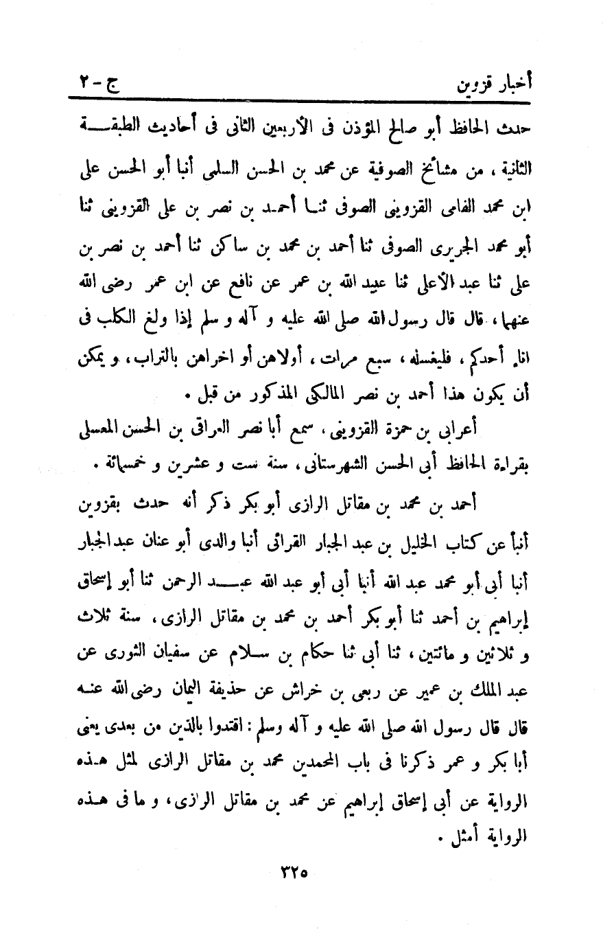 أَحْمَد بْنُ مُحَمَّدِ بْنِ مُقَاتِلٍ الرَّازِيُّ أَبُو بَكْرٍ ذُكِرَ أَنَّهُ حَدَّثَ بِقَزْوِينَ أَنْبَأَ عَنْ كِتَابِ الخليل بْن عَبْد الجبار القرائي أَنْبَأَ وَالِدِي أَبُو عِنَانٍ عَبْدُ الْجَبَّارِ أَنْبَأَ أَبِي أَبُو مُحَمَّدٍ عَبْدُ اللَّهِ أَنْبَأَ أَبِي أَبُو عَبْدِ اللَّهِ عَبْدُ الرَّحْمَنِ ثنا أبو إسحاق إبراهيم بْن أَحْمَدَ ثنا أَبُو بَكْرٍ أَحْمَدُ بْنُ مُحَمَّدِ بْنِ مُقَاتِلٍ الرَّازِيُّ سَنَةَ ثَلاثٍ وَثَلاثِينَ وَمِائَتَيْنِ ثنا أَبِي ثنا حَكَّامُ بْنُ سَلامٍ عَنْ سُفْيَانَ الثَّوْرِيِّ عَنْ عَبْدِ الْمَلَكِ بْنِ عُمَيْرٍ عَنْ رِبْعِيِّ بْنِ خراش عَنْ حُذَيْفَةَ الْيَمَانِ رَضِيَ اللَّهُ عَنْهُ قَالَ: قَالَ رَسُولُ اللَّهِ صَلَّى اللَّهُ عَلَيْهِ وَآلِهِ وَسَلَّمَ: "اقْتَدُوا بِالَّذِينَ مِنْ بَعْدِي" يَعْنِي أَبَا بَكْرٍ وَعُمَرَ ذَكَرْنَا فِي بَابِ الْمُحَمَّدِينَ مُحَمَّدَ بْنَ مُقَاتِلٍ الرَّازِيَّ لِمِثْلِ هَذِهِ الرِّوَايَةِ عَنْ أَبِي إِسْحَاقَ إبراهيم عَنْ مُحَمَّدِ بْنِ مُقَاتِلٍ الرَّازِيِّ وَمَا فِي هذه الرواية أمثل.
