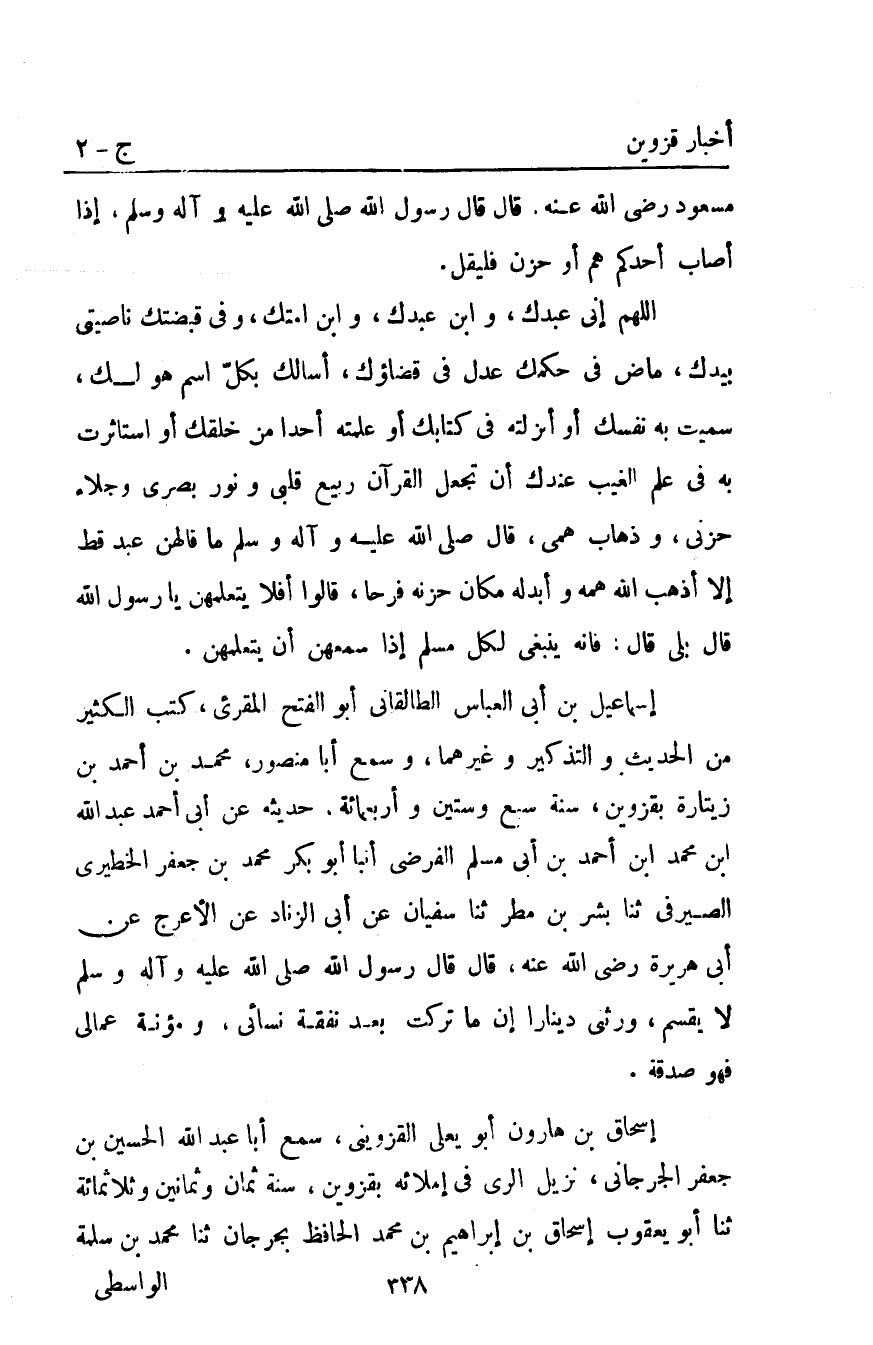 إِسْمَاعِيل بْن أبي الْعَبَّاس الطالقاني أبو الفتح المقرىء كتب الكثير من الحديث والتذكير وغيرهما وَسَمِعَ أَبَا مَنْصُورٍ مُحَمَّدَ بْنَ أَحْمَد بْنِ زيتَارَةَ بِقَزْوِينَ سنة سبع وستين وأربعمائة حَدِيثَهُ عَنْ أَبِي أَحْمَد عَبْدِ الله ابن محمد ابن أَحْمَد بْنِ أَبِي مُسْلِمٍ الْفَرَضِيِّ أَنْبَا أَبُو بَكْرٍ مُحَمَّدُ بْنُ جَعْفَرٍ الْخَطِيرِيُّ الصَّيْرَفِيُّ ثنا بِشْرُ بْنُ مَطَرٍ ثنا سُفْيَانُ عَنْ أَبِي الزِّنَادِ عَنِ الأَعْرَجِ عَنْ أَبِي هُرَيْرَةَ رَضِيَ اللَّهُ عَنْهُ قَالَ: قَالَ رَسُولُ اللَّهِ صَلَّى اللَّهُ عَلَيْهِ وَآلِهِ وَسَلَّمَ: "لا يقسم ورثى دِينَارًا إِنَّ مَا تَرَكْتُ بَعْدَ نفقة نسائي ومؤنة عُمَّالِي فَهُوَ صَدَقَةٌ".