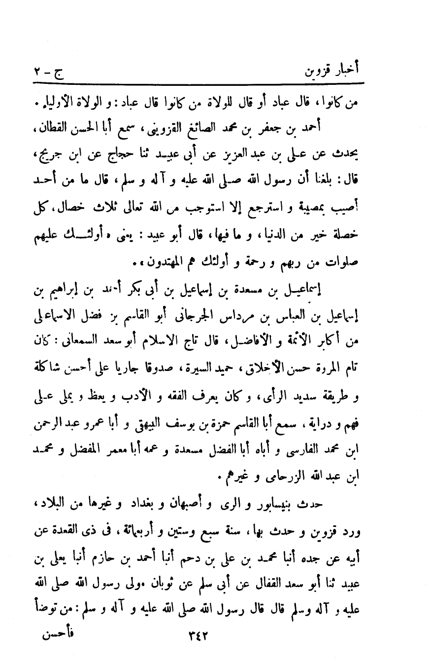 أَحْمَد بْنُ جَعْفَرِ بْنِ مُحَمَّدٍ الصَّائِغُ الْقَزْوِينِيُّ سَمِعَ أَبَا الْحَسَنِ الْقَطَّانَ يُحَدِّثُ عَنْ عَلِيِّ بْنُ عَبْدِ الْعَزِيزِ عَنْ أَبِي عُبَيْدٍ ثنا حَجَّاجٌ عَنِ ابْنِ جريح قَالَ بَلَغَنَا أَنَّ رَسُولَ اللَّهِ صَلَّى اللَّهُ عَلَيْهِ وَآلِهِ وَسَلَّمَ قَالَ: "مَا مِنْ أَحَدٍ أُصِيبَ بِمُصِيبَةٍ وَاسْتَرْجَعَ إِلا اسْتَوْجَبَ مِنَ اللَّهِ تَعَالَى ثَلاثَ خِصَالٍ كُلُّ خَصْلَةٍ خَيْرٌ مِنَ الدُّنْيَا وَمَا فِيهَا" قَالَ أَبُو عُبَيْدٍ يَعْنِي: {أُولَئِكَ عَلَيْهِمْ صَلَوَاتٌ مِنْ رَبِّهِمْ وَرَحْمَةٌ وَأُولَئِكَ هُمُ الْمُهْتَدُونَ} .