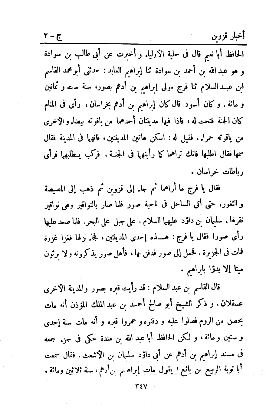 الحافظ أبا نعيم قَالَ فِي حلية الأولياء وأخبرت عن أبي طالب بْن سوادة وهو عَبْد اللَّهِ بْن أَحْمَد بْن سوادة ثنا إبراهيم العابد حدثني أَبُو محمد القاسم ابن عَبْدِ السلام ثنا فرج مولي إبراهيم بْن أدهم بصور سنة ست وثمانين ومائة وكان أسود قَالَ كَانَ إبراهيم بْن أدهم بخراسان رأي فِي المنام كأن الجنة فتحت له فإذا فيها مدينتان أحدهما من ياقوتة بيضاء والأخري من ياقوتة حمراء فقيل له اسكن هاتين المدينتين فإنهما فِي المدينة فقال سمها فقال اطلبها فإنك تراهماكما رأيتهما فِي الجنة فركب يطلبهما فرأي رباطات خراسان.
