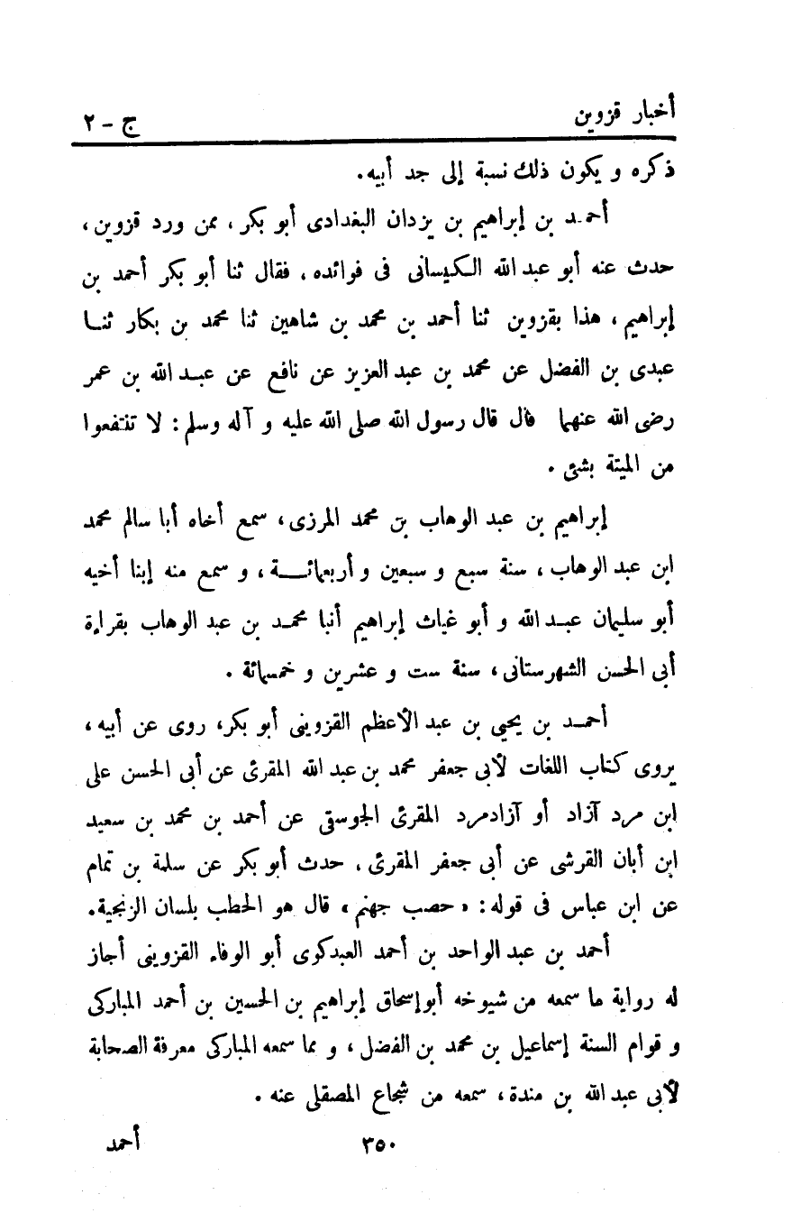 أَحْمَد بْن يَحْيَى بْن عَبْدِ الأعظم الْقَزْوِينِيّ أَبُو بكر روى عن أبيه يروي عن كتاب اللغات لأبي جعفر مُحَمَّد بْن عبد الله المقرىء عن أبي الحسن عَلَى ابن مرد آزاد أو آزادمرد المقرىء الجوسقي عن أَحْمَد بْن مُحَمَّد بن سعيد ابن أبان القرشي عن أبي جعفر المقرىء حدث أَبُو بكر عن سلمة بْن تمام عن ابن عَبَّاس فِي قوله حصب جهنم قَالَ هو الحطب بلسان الزنجية. أَحْمَد بْن عَبْدِ الواحد بْن أَحْمَد العبدكوي أَبُو الوفاء الْقَزْوِينِيّ أجاز له رواية ما سمعه من شيوخه أَبُو إسحاق إبراهيم بْن الحسين بْن أَحْمَد المباركي وقوام السنة إِسْمَاعِيل بْن مُحَمَّد بْن الفضل ومما سمعه المباركي معرفة الصحابة لأبي عَبْد اللَّهِ بْن مَنْدَهْ سمعه من شجاع المصقلي عنه.