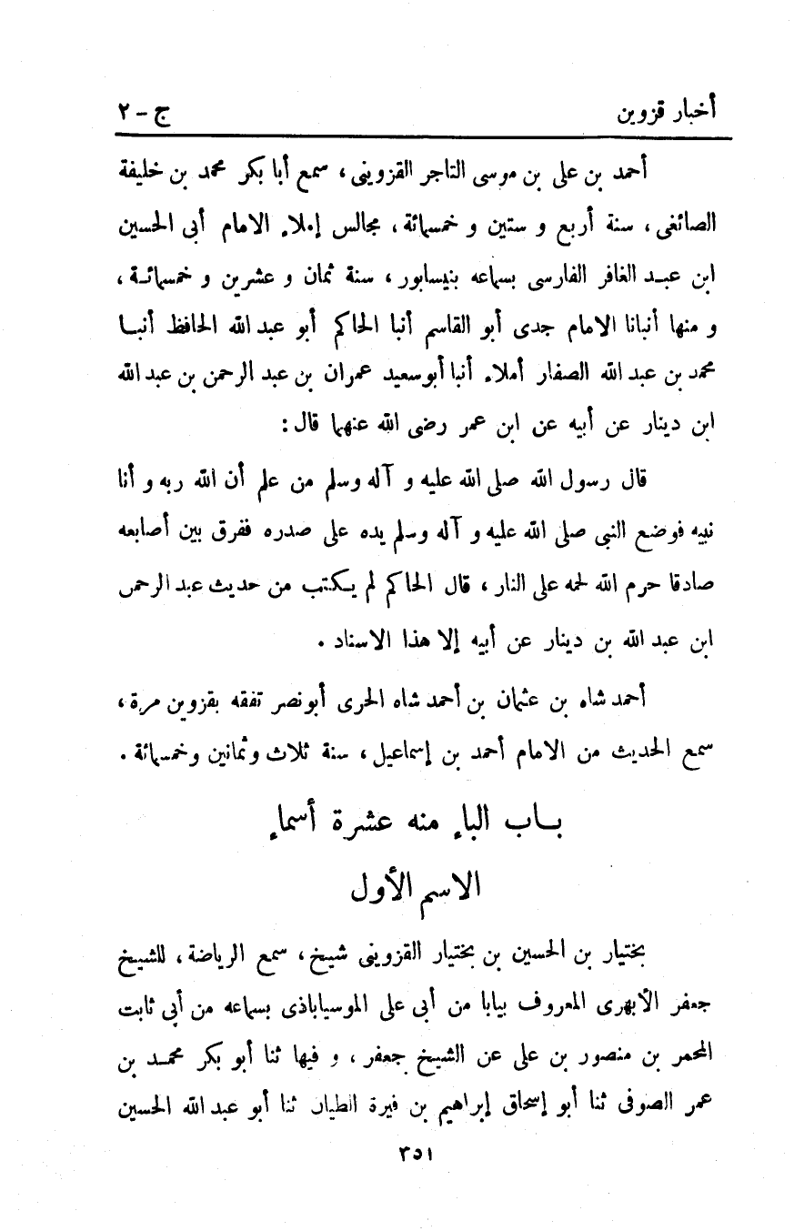 أَحْمَد بْنُ عَلِيِّ بْنِ مُوسَى التَّاجِرُ الْقَزْوِينِيُّ سَمِعَ أَبَا بَكْرٍ مُحَمَّدَ بْنَ خَلِيفَةَ الصَّائِغِيَّ سَنَةَ أربع وستين وخمسمائة مَجَالِسَ إِمْلاءِ الإِمَامِ أَبِي الْحُسَيْنِ ابن عَبْدِ الْغَافِرِ الْفَارِسِيِّ بِسَمَاعِهِ بِنَيْسَابُورَ سنة ثمان وعشرين وخمسمائة وَمِنْهَا أَنْبَأَنَا الإِمَامِ جَدِّي أَبُو الْقَاسِمِ أَنْبَأَ الْحَاكِمُ أَبُو عَبْدِ اللَّهِ الْحَافِظُ أَنْبَأَ مُحَمَّدُ بْنُ عَبْدِ اللَّهِ الصَّفَّارُ إِمْلاءً أَنْبَأَ أَبُو سَعِيدٍ عِمْرَانُ بْنُ عَبْدِ الرحمن بن عبد الله ابن دِينَارٍ عَنْ أَبِيهِ عَنِ ابْنِ عُمَرَ رَضِيَ اللَّهُ عَنْهُمَا قَالَ: