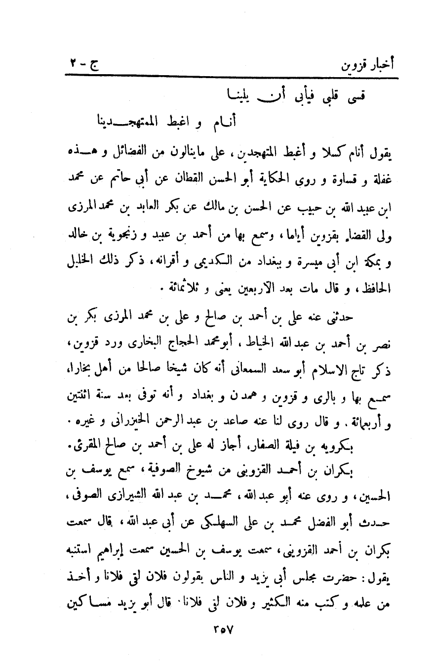 يقول أنام كسلا وأغبط المتهجدين عَلَى ما ينالون من الفضائل وهذه غفلة وقساوة وروي الحكاية أَبُو الحسن القطان عن أبي حاتم عن محمد ابن عبيد اللَّه بْن حبيب عن الحسن بْن مالك بْن بكر العابد بْن مُحَمَّد المرزي ولي القضاء بِقَزْوِينَ أياما وسمع بها من أَحْمَد بْن عبيد وزنجويه بْن خالد وبمكة ابن أبي ميسرة وببغداد من الكديمي وأقرانه ذكر ذلك الخليل الحافظ وقال مات بعد الأربعين يعني وثلاثمائة.