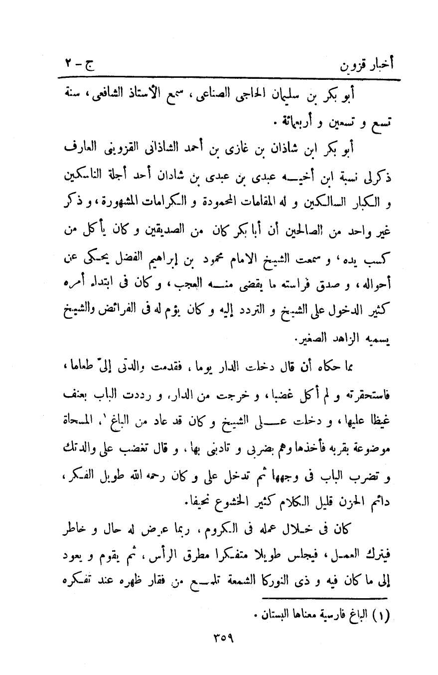 أبو بكر ابن شاذان بْن غازي بْن أَحْمَد الشاذاني الْقَزْوِينِيّ العارف ذكر لي نسبة ابن أخيه عبدي بْن عبدي بْن شادان أحد أجلة الناسكين والكبار السالكين وله المقامات المحمودة والكرامات المشهورة وذكر غير واحد من الصالحين أن أبا بكر كَانَ من الصديقين وكان يأكل من كسب يده وسمعت الشيخ الإمام محمود بْن إبراهيم الفضل يحكي عن أحواله وصدق فراسته ما يقضي منه العجب وكان فِي ابتداء أمره كثير الدخول عَلَى الشيخ والتردد إليه وكان يؤم له فِي الفرائض والشيخ يسميه الزاهد الصغير.