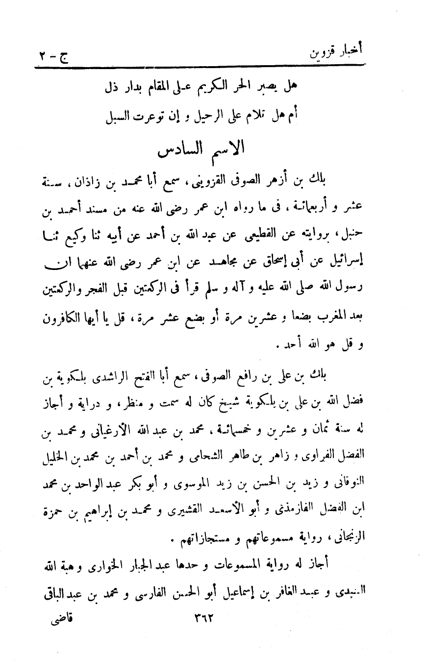 بَلْكِ بْنِ أَزْهَرَ الصُّوفِيُّ الْقَزْوِينِيُّ سَمِعَ أَبَا مُحَمَّدِ بْنَ زَاذَانَ سنة عشر وأربعمائة فِي مَا رَوَاهُ ابْنُ عُمَرَ رَضِيَ اللَّهُ عَنْهُ مِنْ مُسْنَدِ أَحْمَدَ بْنِ حَنْبَلٍ بِرِوَايَتِهِ عَنِ الْقَطِيعِيِّ عَنْ عَبْدِ اللَّهِ بْنِ أَحْمَد عَنْ أَبِيهِ ثنا وَكِيعٌ ثنا إسرائيل عن أبي إسحاق عَنْ مُجَاهِدٍ عَنِ ابْنِ عُمَرَ رَضِيَ اللَّهُ عَنْهُمَا أَنَّ رَسُولَ اللَّهِ صَلَّى اللَّهُ عَلَيْهِ وَآلِهِ وَسَلَّمَ قَرَأَ فِي الرَّكْعَتَيْنِ قَبْلَ الْفَجْرِ وَالرَّكْعَتَيْنِ بَعْدَ الْمَغْرِبِ بِضْعًا وَعِشْرِينَ مَرَّةً أَوْ بِضْعَ عَشَرَ مَرَّةً {قُلْ يَا أَيُّهَا الْكَافِرُونَ} وَ {قُلْ هُوَ اللَّهُ أَحَدٌ} .