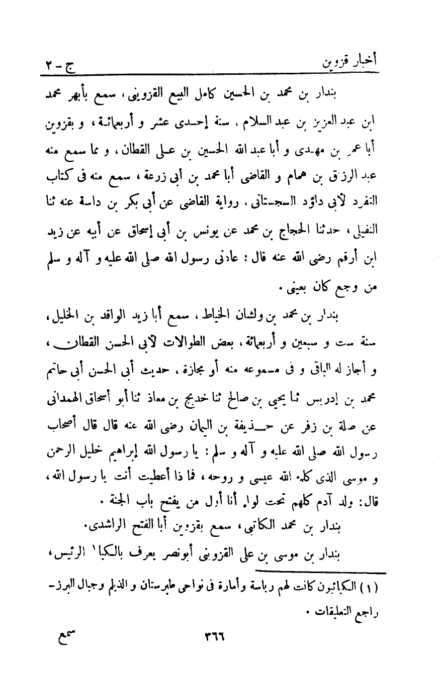 بُنْدَارُ بْنُ مُحَمَّدِ بْنِ الْحُسَيْنِ كَامِلٌ الْبَيِّعُ الْقَزْوِينِيُّ سَمِعَ بِأَبْهَرَ مُحَمَّدُ بْنُ عَبْدِ الْعَزِيزِ بْنُ عَبْدِ السَّلامِ سَنَةَ إِحْدَى عَشَرَ وأربعمائة وَبِقَزْوِينَ أَبَا عُمَرَ بْنَ مَهْدِيٍّ وَأَبَا عَبْدِ اللَّهِ الْحُسَيْنَ بْنَ عَلِيٍّ الْقَطَّانَ وَمِمَّا سَمِعَ مِنْهُ عَبْدَ الرَّزَّاقِ بْنَ هَمَّامٍ وَالْقَاضِي أَبَا مُحَمَّدِ بْنَ أَبِي زُرْعَةَ سَمِعَ مِنْهُ فِي كِتَابِ التَّفَرُّدِ لأبي داؤد السِّجِسْتَانِيِّ رِوَايَةَ الْقَاضِي عَنْ أَبِي بَكْرِ بْنِ دَاسَةَ عَنْهُ ثنا النُّفَيْلِيُّ حَدَّثَنَا الْحَجَّاجُ بْنُ مُحَمَّدٍ عَنْ يُونُسَ بْنِ أَبِي إِسْحَاقَ عن أبيه عن زيد ابن أَرْقَمَ رَضِيَ اللَّهُ عَنْهُ قَالَ عَادَنِي رَسُولُ اللَّهِ صَلَّى اللَّهُ عليه وآله وَسَلَّمَ مِنْ وَجَعٍ كَانَ بِعَيْنِي.