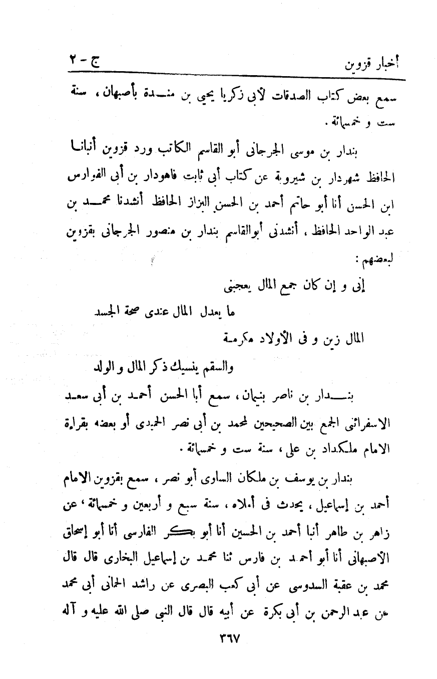بُنْدَارُ بْنُ يُوسُفَ بْنِ مَلْكَانَ السَّاوِيُّ أَبُو نَصْرٍ سَمِعَ بِقَزْوِينَ الإمَامَ أَحْمَدَ بْنَ إِسْمَاعِيلَ يُحَدِّثُ فِي أَمْلاهُ سَنَةَ سَبْعٍ وَأَرْبَعِينَ وخمسمائة عَنْ زَاهِرِ بْنِ طَاهِرٍ أَنْبَأَ أَحْمَد بْنُ الْحُسَيْنِ أنا أَبُو بَكْرٍ الْفَارِسِيُّ أنا أَبُو إِسْحَاقَ الأَصْبَهَانِيُّ أنا أَبُو أَحْمَد بْنُ فَارِسٍ ثنا مُحَمَّدُ بْنُ إِسْمَاعِيل الْبُخَارِيُّ قَالَ قَالَ مُحَمَّدُ بْنُ عُقْبَةَ السَّدُوسِيُّ عَنْ أَبِي كَعْبٍ الْبَصْرِيِّ عَنْ رَاشِدٍ الْحِمَّانِيِّ أَبِي مُحَمَّدٍ عَنْ عَبْدِ الرَّحْمَنِ بْنِ أَبِي بَكْرَةَ عَنْ أَبِيهِ قَالَ: قَالَ النَّبِيُّ صَلَّى اللَّهُ عَلَيْهِ وآله