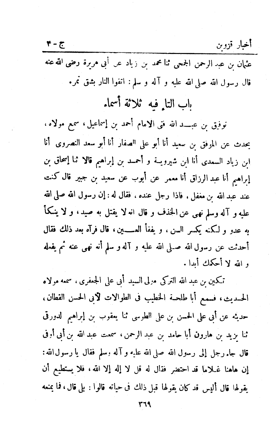 توفيق بْنُ عَبْدِ اللَّهِ فَتَى الإِمَامِ أَحْمَد بْنَ إِسْمَاعِيل سَمِعَ مَوْلاهُ يُحَدِّثُ عَنِ الْمُوَفَّقِ بْنِ سَعِيدٍ أنا أَبُو عَلِيٍّ الصَّفَّارُ أنا أَبُو سَعْدٍ النَّصْرُوِيُّ أنا ابْنُ زياد السمدي أنا ابْنُ شِيرَوَيْهِ وَأَحْمَد بْنُ إبراهيم قَالا ثنا إِسْحَاقُ بْنُ إبراهيم أنا عَبْدُ الرَّزَّاقِ أنا مَعْمَرٌ عَنْ أَيُّوبَ عَنْ سَعِيدِ بْنِ جُبَيْرٍ قَالَ كُنْتُ عِنْدَ عَبْدِ اللَّهِ بْنِ مُغَفَّلٍ فَإِذَا رَجُلٌ عِنْدَهُ فَقَالَ لَهُ إِنَّ رَسُولُ اللَّهِ صَلَّى اللَّهُ عَلَيْهِ وآله وَسَلَّمَ نَهَى عَنِ الْخَذْفِ وَقَالَ: "إِنَّهُ لا يُقْتَلُ بِهِ صَيْدٌ وَلا يُنْكَأُ بِهِ عَدُوٌّ وَلَكِنَّهُ يَكْسِرُ السِّنَّ وَيَفْقَأُ الْعَيْنَ". قَالَ فَرَآهُ بَعْدَ ذَلِكَ فَقَالَ أَحَدَّثْتَ عَنْ رَسُولِ اللَّهِ صَلَّى اللَّهُ عليه وآله وَسَلَّمَ أَنَّهُ نَهَى عَنْهُ ثُمَّ يَفْعَلُهُ وَاللَّهِ لا أُحَكِّمُكَ أَبَدًا.