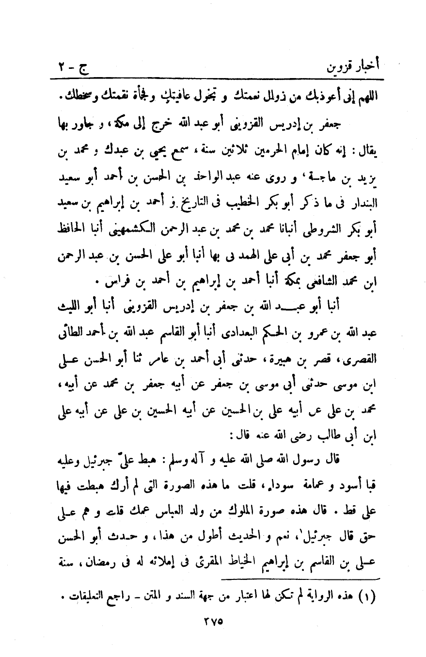 قَالَ رَسُولُ اللَّهِ صَلَّى الله عليه وآله وَسَلَّمَ: "هَبَطَ عَلَيَّ جِبْرَئِيلُ وَعَلَيْهِ قبا أَسْوَدُ وَعِمَامَةٌ سَوْدَاءُ قُلْتُ مَا هَذِهِ الصُّورَةُ الَّتِي لَمْ أَرَكَ هَبَطْتَ فِيهَا عَلَيَّ قَطُّ قَالَ هَذِهِ صُورَةُ الْمُلُوكِ مِنْ وَلِدِ الْعَبَّاسِ عَمِّكَ قُلْتُ وَهُمْ عَلَى حَقٍّ قَالَ جِبْرَئِيلُ1 نَعَمْ". وَالْحَدِيثُ أَطْوَلُ مِنْ هَذَا وَحَدَّثَ أَبُو الْحَسَنِ عَلِيِّ بْنِ الْقَاسِمِ بْنِ إبراهيم الخياط المقرىء فِي إِمْلائِهِ لَهُ فِي رَمَضَانَ سنة
