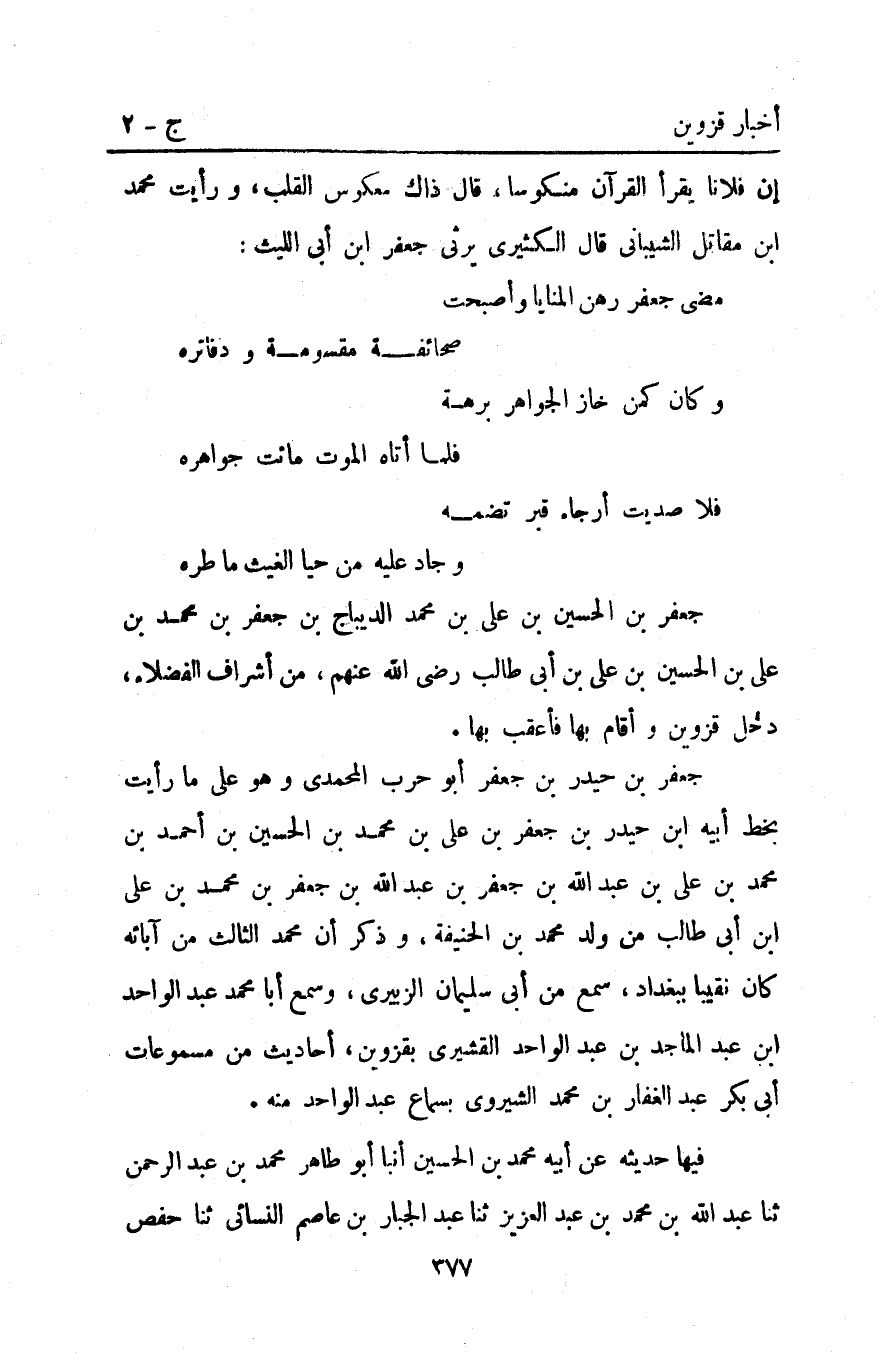 جعفر بْن الحسين بْن علي بْن مُحَمَّد الديباج بْن جعفر بْنُ مُحَمَّدِ بْنِ عَلِيِّ بْنِ الحسين بْن علي بْن أبي طالب رَضِيَ اللَّهُ عنهم من أشراف الفضلاء دخل قزوين وأقام بها فأعقب بها.