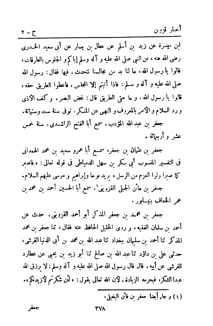 جعفر بْن مائن الجبلي الْقَزْوِينِيّ1 سمع أبا الحسين أَحْمَد بْن مُحَمَّد بْن عمر الخفاف بنيسابور. جعفر بْن مُحَمَّد بْن جعفر المذكر أَبُو أَحْمَد الْقَزْوِينِيّ حدث عن أَحْمَد بْن سلمان الفقيه وروي الخليل الحافظ عَنْهُ فقال ثنا جَعْفَرُ بْنُ مُحَمَّدٍ الْمُذَكِّرُ ثنا أَحْمَد بْنُ سُلَيْمَانَ بِبَغْدَادَ ثنا عَبْدُ اللَّهِ بْنُ مُحَمَّدِ بْنِ أَبِي الدُّنْيَا الْقُرَشِيُّ حدثني علي بن داؤد ثَنَا عَبْدُ اللَّهِ بْنُ صَالِحٍ ثنا أَبُو زَيْدِ بْنُ يَحْيَى عَنْ عُطَارِدٍ الْقُرَشِيِّ عَنْ أَبِيهِ قَالَ: قَالَ رَسُولُ اللَّهِ صَلَّى اللَّهُ عَلَيْهِ وَآلِهِ وَسَلَّمَ: "لا يرزق الله عبد الشُّكْرَ فَيَحْرِمُهُ الزِّيَادَةَ" لأَنَّ اللَّهَ تَعَالَى يَقُولُ: {لَئِنْ شَكَرْتُمْ لَأَزِيدَنَّكُمْ} .