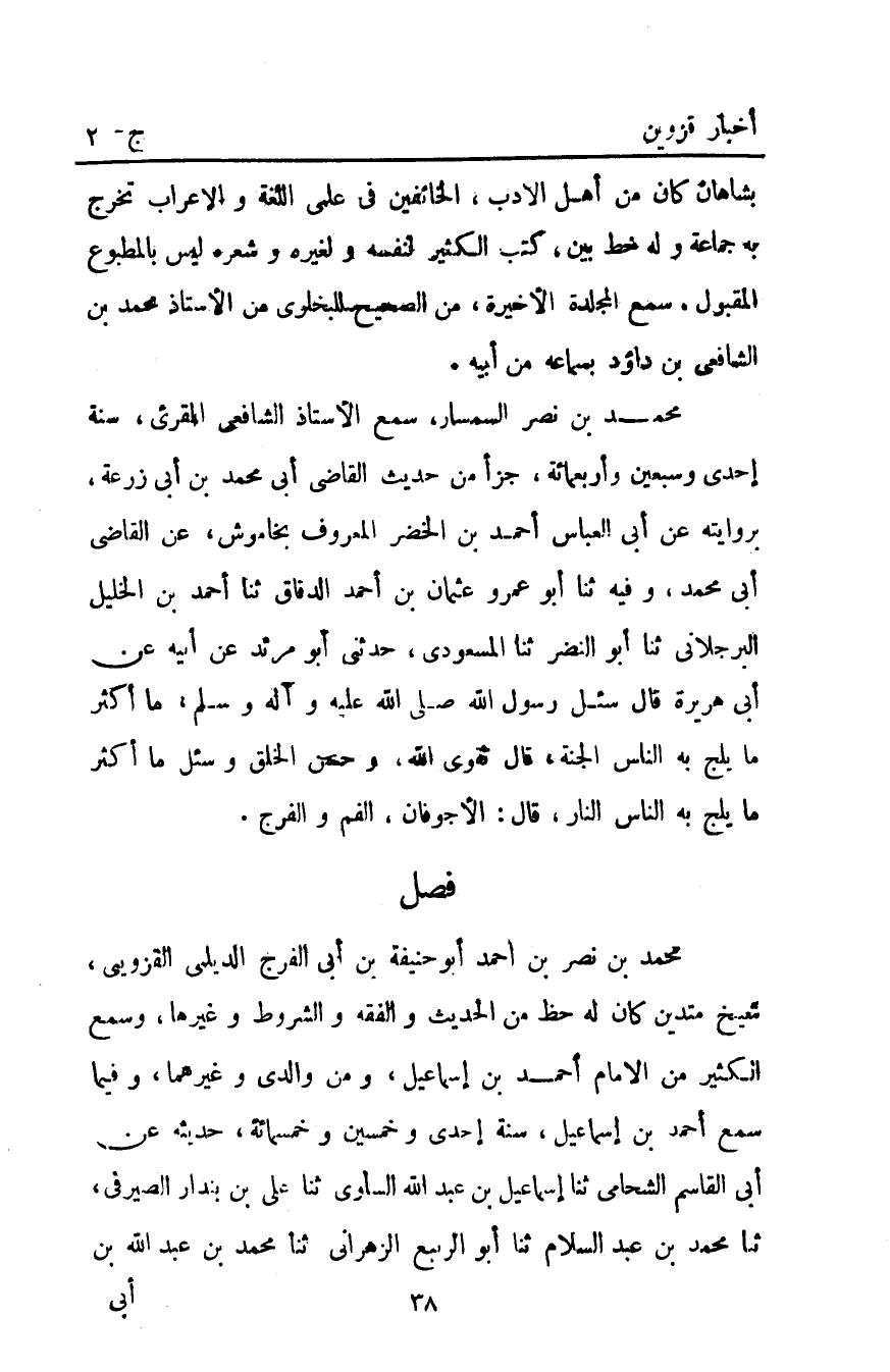 مُحَمَّدُ بْنُ نَصْرٍ السِّمْسَارُ سَمِعَ الأُسْتَاذَ الشَّافِعِيَّ المقرىء سنة إحدى وسبعين وأربعمائة جزأ من حديث القاضي أبي مُحَمَّد بْنِ أَبِي زُرْعَةَ بِرِوَايَتِهِ عَنْ أبي العباس أَحْمَد بْن الخضر المعروف بخاموش عن القاضي أبي مُحَمَّدٍ وَفِيهِ ثنا أَبُو عَمْرٍو عُثْمَانُ بْنُ أَحْمَدَ الدَّقَّاقُ ثنا أَحْمَدُ بْنُ الْخَلِيلِ الْبُرْجُلانِيُّ ثنا أَبُو النَّضْرِ ثنا الْمَسْعُودِيُّ حَدَّثَنِي أَبُو مَرْثَدٍ عَنْ أَبِيهِ عَنْ أَبِي هُرَيْرَةَ قَالَ سُئِلَ رَسُولُ اللَّهِ صَلَّى اللَّهُ عَلَيْهِ وَآلِهِ وَسَلَّمَ مَا أَكْثَرُ مَا يَلِجُ بِهِ النَّاسُ الْجَنَّةَ قَالَ: "تَقْوَى اللَّهِ وَحُسْنُ الْخُلُقِ وَسُئِلَ مَا أَكْثَرُ مَا يَلِجُ بِهِ النَّاسُ النَّارَ قَالَ الأَجْوَفَانِ الْفَمُ وَالْفَرْجُ".