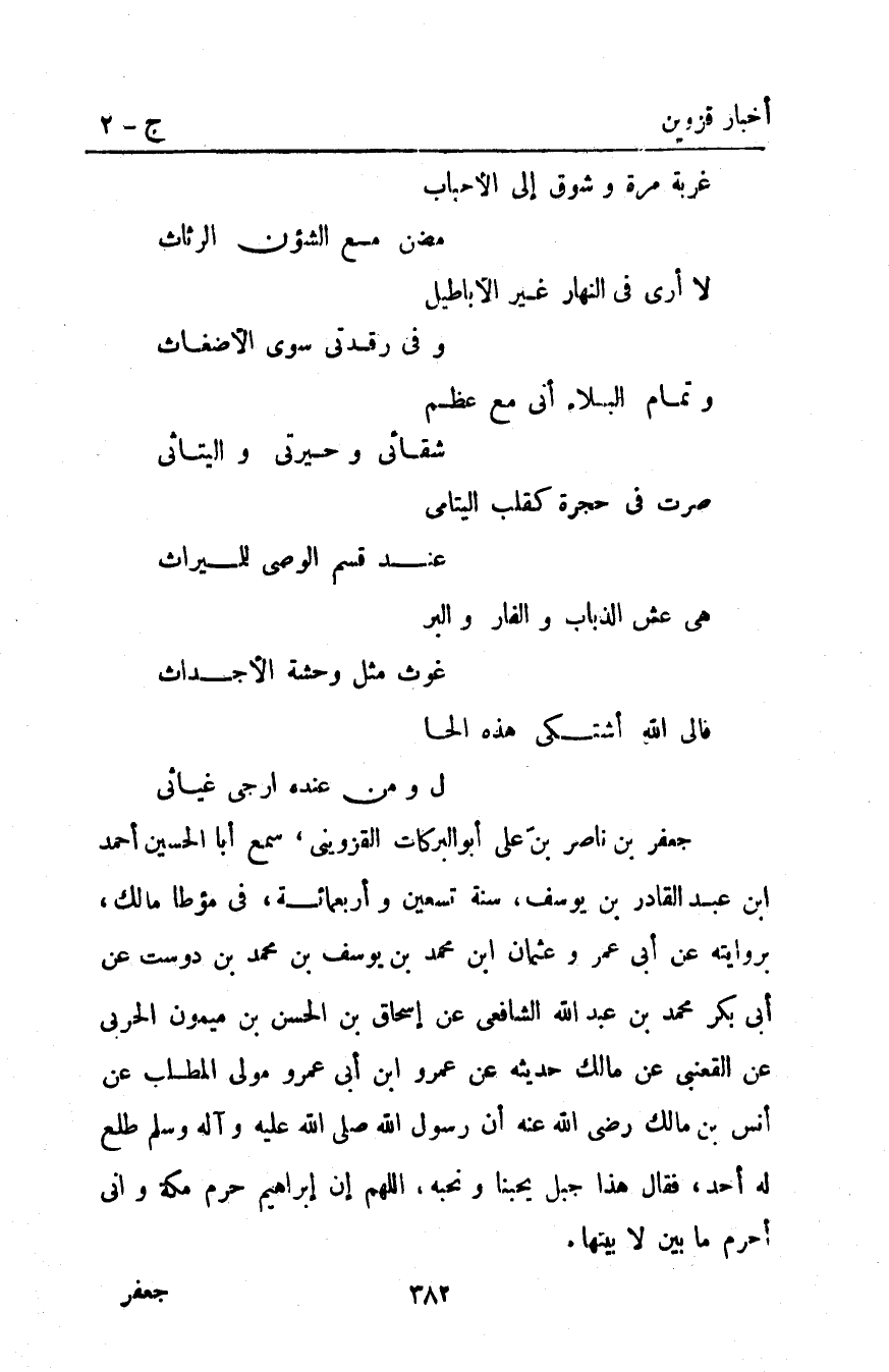 جعفر بْنُ نَاصِرِ بْنِ عَلِيٍّ أَبُو الْبَرَكَاتِ الْقَزْوِينِيُّ سَمِعَ أَبَا الْحُسَيْنِ أحمد ابن عَبْدِ الْقَادِرِ بْنِ يُوسُفَ سَنَةَ تسعين وأربعمائة في مؤطا مَالِكٍ بِرِوَايَتِهِ عَنْ أَبِي عُمَرَ وعثمان ابن مُحَمَّد بْن يوسف بْن مُحَمَّد بْنِ دُوسْتَ عَنْ أَبِي بَكْرٍ مُحَمَّد بْن عَبْد اللَّه الشافعي عَنْ إِسْحَاقَ بْنِ الْحَسَنِ بْنِ ميمون الحربي عن القعنبي عَنْ مَالِكٍ حَدِيثَهُ عَنْ عَمْرِو ابن أَبِي عَمْرٍو مَوْلَى الْمُطَّلِبِ عَنْ أَنَسِ بْنِ مَالِكٍ رَضِيَ اللَّهُ عنه أن رسول اللَّه صَلَّى الله عليه وآله وَسَلَّمَ: طَلَعَ لَهُ أُحُدٌ فَقَالَ: "هَذَا جَبَلٌ يُحِبُّنَا وَنُحِبُّهُ اللَّهُمَّ إِنَّ إبراهيم حَرَّمَ مَكَّةَ وَإِنِّي أحرم ما بين لا بيتها".