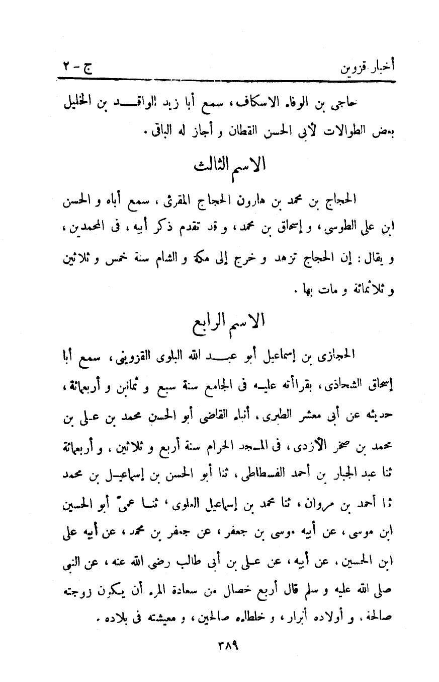 الحجازي بْن إِسْمَاعِيل أَبُو عَبْد اللَّهِ البلوي الْقَزْوِينِيّ سَمِعَ أَبَا إِسْحَاقَ الشحاذى بقراأته عَلَيْهِ فِي الْجَامِعِ سَنَةَ سَبْعٍ وثمانين وأربعمائة حديثه عن أبي معشر الطبري أَنْبَأَ الْقَاضِي أَبُو الْحَسَنِ مُحَمَّدُ بْنُ عَلِيِّ بْنِ مُحَمَّدِ بْنِ صَخْرٍ الأَزْدِيُّ فِي الْمَسْجِدِ الْحَرَامِ سنة أربع وثلاثين وأربعمائة ثنا عَبْدُ الْجَبَّارِ بْنُ أَحْمَد الْفُسْطَاطِيُّ ثنا أَبُو الْحَسَنِ بْنُ إِسْمَاعِيل بْنِ مُحَمَّدٍ ثنا أَحْمَد بْنُ مَرْوَانَ ثنا مُحَمَّدُ بْنُ إِسْمَاعِيل الْعَلَوِيُّ ثنا عَمِّي أَبُو الحسين ابن مُوسَى عَنْ أَبِيهِ مُوسَى بْنِ جَعْفَرٍ عَنْ جَعْفَرِ بْنِ مُحَمَّدٍ عن أبيه على ابن الْحُسَيْنِ عَنْ أَبِيهِ عَنْ عَلِيِّ بْنِ أَبِي طَالِبٍ رَضِيَ اللَّهُ عنه عن النبي صَلَّى اللَّهُ عليه وآله وَسَلَّمَ قَالَ أَرْبَعُ خِصَالٍ مِنْ سَعَادَةِ الْمَرْءِ أَنْ يَكُونَ زَوْجَتُهُ صالحة وأولاده أبرار وخلطاءه صالحين ومعيشته في بلاده