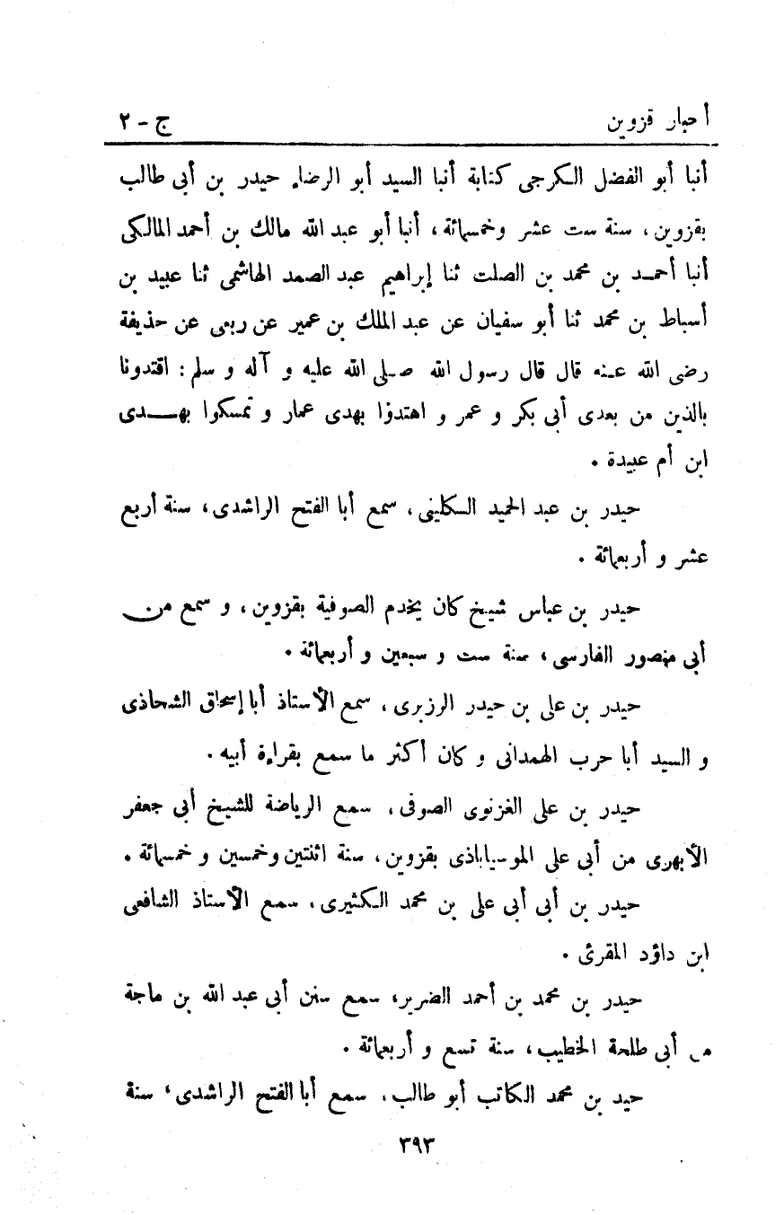 أَنْبَأَ أَبُو الْفَضْلِ الْكَرَجِيُّ كِتَابَةً أَنْبَأَ السَّيِّدُ أَبُو الرِّضَاءِ حَيْدَرُ بْنُ أَبِي طَالِبٍ بِقَزْوِينَ سَنَةَ ست عشر وخمسمائة أَنْبَأَ أَبُو عَبْدِ اللَّهِ مَالِكُ بْنُ أَحْمَد الْمَالِكِيُّ أَنْبَأَ أَحْمَد بْنُ مُحَمَّدِ بْنِ الصَّلْتِ ثنا إبراهيم عَبْدُ الصَّمَدِ الْهَاشِمِيُّ ثنا عُبَيْدُ بْنُ أَسْبَاطِ بْنِ مُحَمَّدٍ ثنا أَبُو سُفْيَانَ عَنْ عَبْدِ الْمَلَكِ بْنِ عُمَيْرٍ عَنْ رِبْعِيِّ عَنْ حُذَيْفَةَ رَضِيَ اللَّهُ عَنْهُ قَالَ: قَالَ رَسُولُ اللَّهِ صَلَّى الله عليه وآله وَسَلَّمَ: "اقْتَدُونَا بِالَّذِينَ مِنْ بَعْدِي أَبِي بَكْرٍ وَعُمَرَ وَاهْتَدُوا بِهُدَى عَمَّارٍ وَتَمَسَّكُوا بِهُدَى ابْنِ أُمِّ عُبَيْدَةَ".