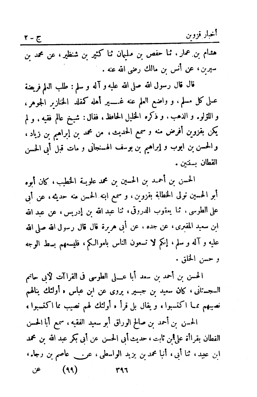 قَالَ: قَالَ رَسُولُ اللَّهِ صَلَّى اللَّهُ عَلَيْهِ وَآلِهِ وَسَلَّمَ: "طَلَبُ الْعِلْمِ فَرِيضَةٌ عَلَى كل مسلم" وواضع العلم عنه غَيْرِ أَهْلِهِ كَمُقَلِّدِ الْخَنَازِيرَ الْجَوْهَرَ وَاللُّؤْلُؤَ وَالذَّهَبَ وذكره الخليل الحافظ فقال شيخ عالم فقيه ولم يكن بِقَزْوِينَ أفرض منه وسمع الحديث من مُحَمَّد بْن إبراهيم بْن زياد والحسن بْن أيوب وإبراهيم بْن يوسف الهسنجاني ومات قبل أبي الحسن القطان بسنتين.