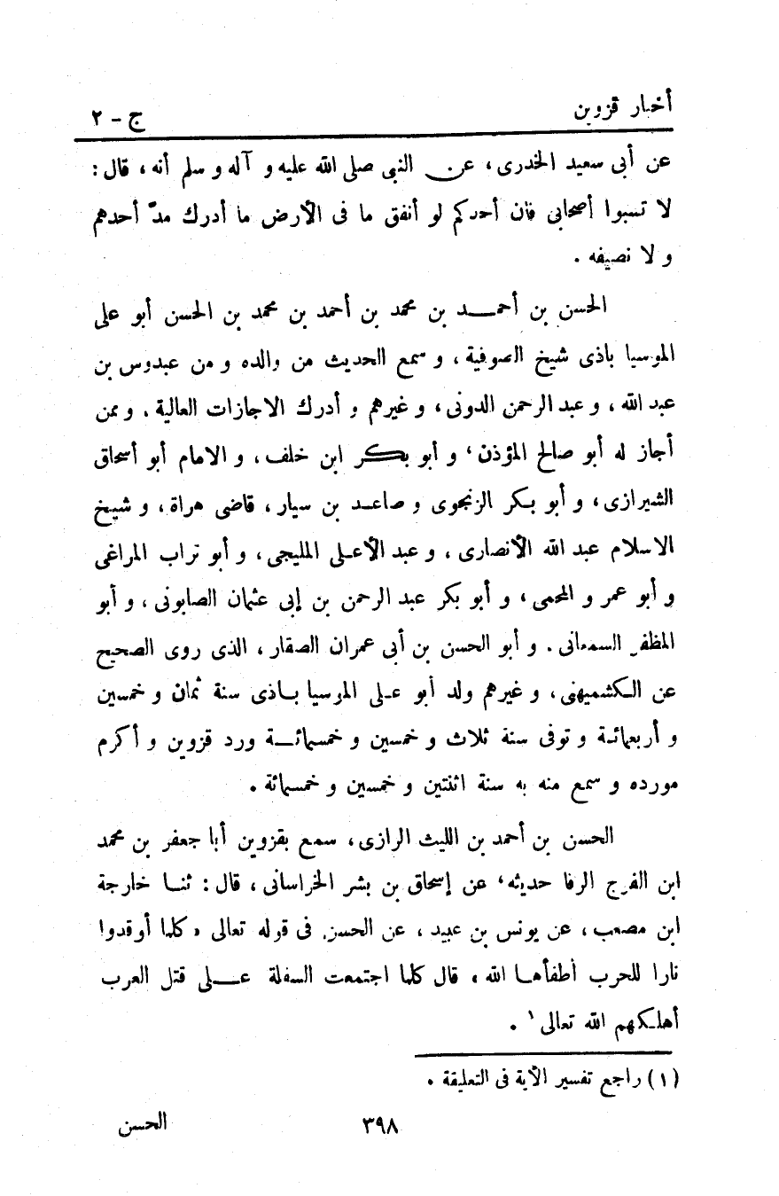 الحسن بْن أَحْمَد بْن الليث الرازي سمع بِقَزْوِينَ أبا جعفر بن محمد ابن الفرج الرفا حديثه عن إسحاق بْن بشر الخراساني قَالَ ثنا خارجة ابن مصعب عن يونس بْن عبيد عن الحسن في قوله تعالى: {كُلَّمَا أَوْقَدُوا نَاراً لِلْحَرْبِ أَطْفَأَهَا اللَّهُ} قَالَ كلما اجتمعت السفلة عَلَى قتل العرب أهلكهم اللَّه تعالى1.