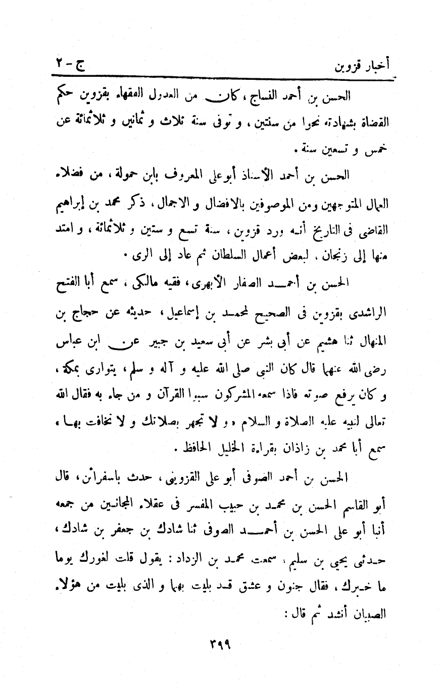 الحسن بْن أَحْمَد النساج كَانَ من العدول الفقهاء بِقَزْوِينَ حكم القضاة بشهادته نحوا من سنتين وتوفي سنة ثلاث وثمانين وثلاثمائة عن خمس وتسعين سنة.