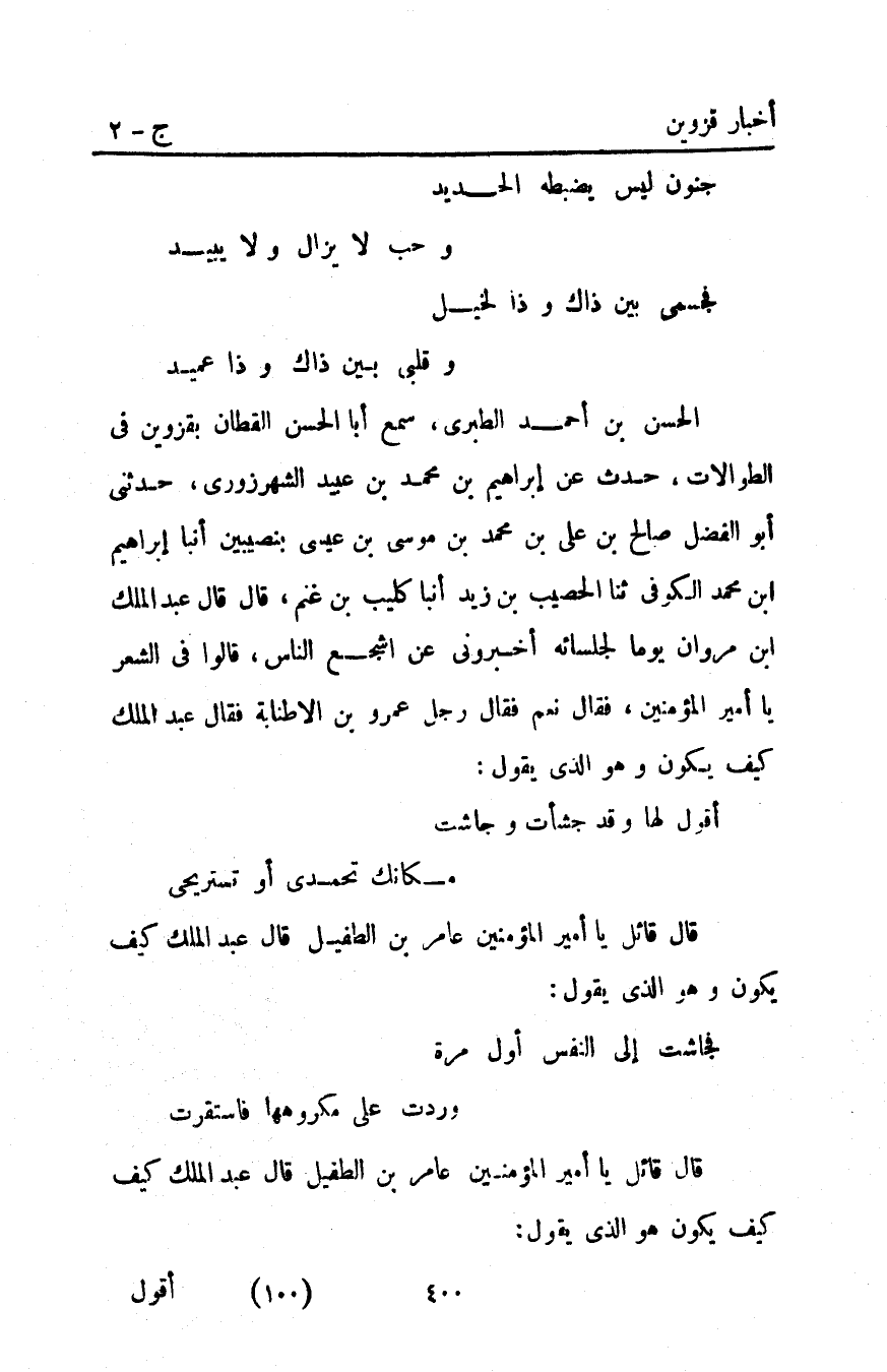 الحسن بْن أَحْمَد الطبري سمع أبا الْحَسَنِ الْقَطَّانَ بِقَزْوِينَ فِي الطُّوالاتِ حدث عن إبراهيم بْن مُحَمَّد بْن عبيد الشهرزوري حدثني أَبُو الفضل صالح بْن علي بْن مُحَمَّد بْن مُوسَى بْن عِيسَى بنصيبين أنبأ إبراهيم ابن مُحَمَّد الكوفي ثنا الحصيب بْن زيد أنبأ كليب بْن غنم قال قال عبد الملك ابن مروان يوما لجلسائه أخبروني عن أشجع الناس قالوا فِي الشعر يا أمير المؤمنين فقال نعم فقال رجل عمرو بْن الأطنابة فقال عَبْد الملك كيف يكون وهو الذي يقول: