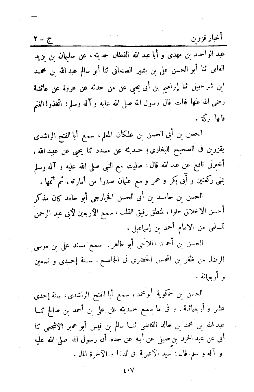 الْحَسَنُ بْنُ أَبِي الْحَسَنِ بْنِ علكانَ الْمُعَلِّمُ سَمِعَ أَبَا الْفَتْحِ الرَّاشِدِيَّ بِقَزْوِينَ فِي الصَّحِيحِ لِلْبُخَارِيِّ حَدِيثَهُ عَنْ مُسَدَّدٍ ثنا يَحْيَى عَنْ عُبَيْدِ اللَّهِ أَخْبَرَنِي نَافِعٌ عَنْ عَبْدِ اللَّهِ قَالَ صَلَّيْتُ مَعَ النَّبِيَّ صَلَّى اللَّهُ عَلَيْهِ وَآلِهِ وَسَلَّمَ بِمِنًى رَكْعَتَيْنِ وَأَبِي بَكْرٍ وَعُمَرَ وَمَعَ عُثْمَانَ صَدْرًا مِنْ إِمَارَتِهِ ثُمَّ أَتَمَّهَا.