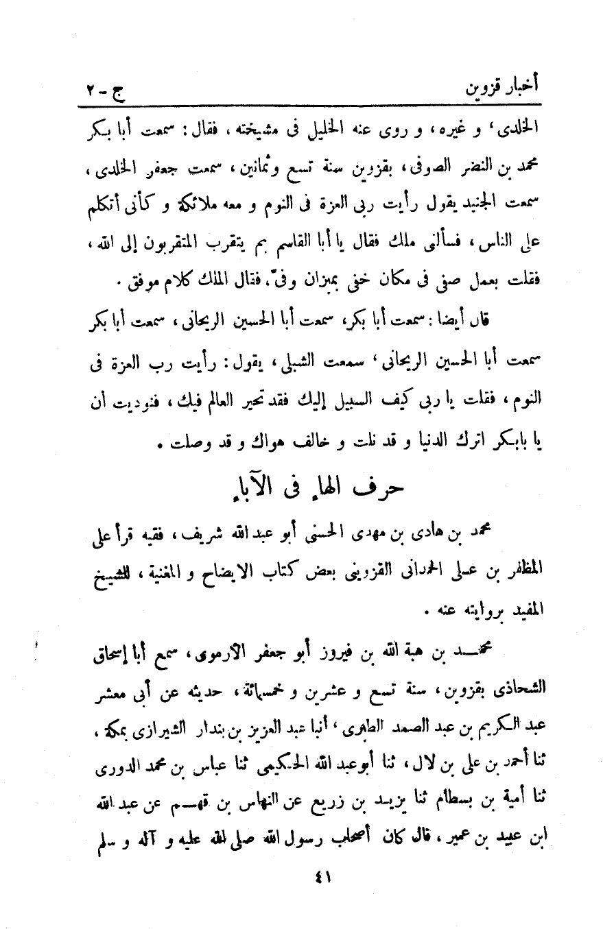 الْخُلْدِيِّ وَغَيْرِهِ وَرَوَى عَنْهُ الْخَلِيلُ فِي مَشْيَخَتِهِ فَقَالَ سَمِعْتُ أَبَا بَكْرٍ مُحَمَّدَ بْنَ النَّضْرِ الصُّوفِيَّ بِقَزْوِينَ سَنَةَ تِسْعٍ وَثَمَانِينَ سَمِعْتُ جعفر الْخُلْدِيَّ سَمِعْتُ الْجُنَيْدَ يَقُولُ رَأَيْتُ ربي الْعِزَّةِ فِي النَّوْمِ وَمَعَهُ مَلائِكَةٌ وَكَأَنِّي أَتَكَلَّمُ عَلَى النَّاسِ فَسَأَلَنِي مَلَكٌ فَقَالَ يَا أَبَا الْقَاسِمِ بِمَ يَتَقَرَّبُ الْمُتَقَرِّبُونَ إِلَى اللَّهِ فَقُلْتُ بِعَمَلٍ صَفِيٍّ فِي مَكَانٍ خَفِيٍّ بِمِيزَانٍ وَفِيٍّ فَقَالَ الْمَلَكُ كَلامٌ مُوَفَّقٌ.
