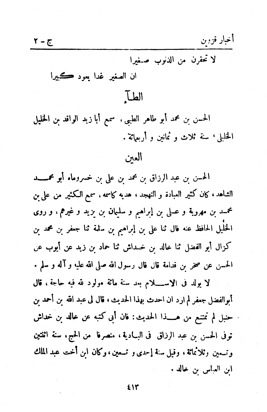 الحسن بْن عَبْد الرزاق بْن مُحَمَّد بْن علي بْن خسروماه أَبُو مُحَمَّدٍ الشَّاهِدُ كَانَ كَثِيرَ الْعِبَادَةِ وَالتَّهَجُّدِ هَدِيَّةً كَاسْمِهِ سَمِعَ الْكَثِيرَ مِنْ عَلِيِّ بْنِ مُحَمَّدِ بْن مهرويه وعلي بْن إبراهيم وَسُلَيْمَانَ بْنِ يَزِيدَ وَغَيْرِهِمْ وَرَوَى الْخَلِيلُ الْحَافِظُ عَنْهُ قَالَ ثنا عَلِيُّ بْنُ إِبْرَاهِيمَ بْنِ سَلَمَةَ ثَنَا جَعْفَرُ بْنُ مُحَمَّدِ بْنِ كَزَالٍ أَبُو الْفَضْلِ ثنا خَالِدُ بْنُ خِدَاشٍ ثنا حَمَّادُ بْنُ زَيْدٍ عَنْ أَيُّوبَ عَنِ الْحَسَنِ عَنْ صَخْرِ بْنِ قُدَامَةَ قَالَ: قَالَ رَسُولُ اللَّهِ صَلَّى اللَّهُ عليه وآله وَسَلَّمَ: