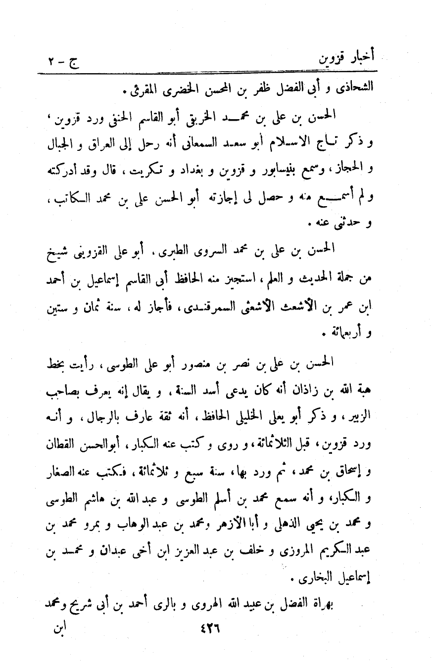 الحسن بْن علي بْن مُحَمَّد السروي الطبري أَبُو عَلَى الْقَزْوِينِيّ شيخ من جملة الحديث والعلم استجيز منه الحافظ أبي القاسم إسماعيل بن أحمد ابن عمر بْن الأشعث الأشعثي السمرقندي فأجاز له سنة ثمان وستين وأربعمائة.