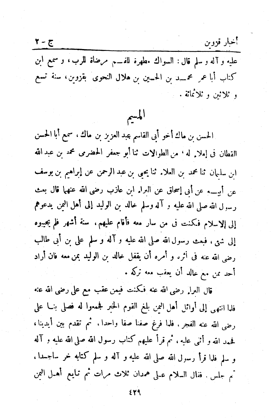 الحسن بْنُ مَاكٍ أَخُو أَبِي الْقَاسِمِ عَبْدِ الْعَزِيزِ بْنِ مَاكٍ سَمِعَ أَبَا الْحَسَنِ الْقَطَّانَ فِي إِمْلاءٍ لَهُ مِنَ الطُّوالاتِ ثنا أَبُو جَعْفَرٍ الْحَضْرَمِيُّ مُحَمَّدُ بْنُ عَبْدِ الله ابن سُلَيْمَانَ ثنا مُحَمَّدُ بْنُ الْعَلاءِ ثَنَا يَحْيَى بْنُ عَبْدِ الرَّحْمَنِ عَنْ إبراهيم بْنِ يُوسُفَ عَنْ أَبِيهِ عَنْ أَبِي إِسْحَاقَ عَنْ البراء ابن عَازِبٍ رَضِيَ اللَّهُ عَنْهُمَا قَالَ بَعَثَ رَسُولُ اللَّهِ صَلَّى اللَّهُ عليه وآله وَسَلَّمَ خَالِدَ بْنَ الْوَلِيدِ إِلَى أَهْلِ الْيَمَنِ يَدْعُوهُمْ إِلَى الإِسْلامِ فَكُنْتُ فِي مَنْ سَارَ مَعَهُ فَأَقَامَ عَلَيْهِمْ سِتَّةَ أَشْهُرٍ فَلَمْ يُجِيبُوهُ إِلَى شَيْءٍ فَبَعَثَ رَسُولُ اللَّهِ صَلَّى اللَّهُ عَلَيْهِ وَآلِهِ وَسَلَّمَ عَلِيَّ بْنَ أَبِي طَالِبٍ رَضِيَ اللَّهُ عَنْهُ فِي أَثَرِهِ وَأَمَرَهُ أَنْ يُقْفِلَ خَالِدَ بْنَ الْوَلِيدِ بِمَنْ مَعَهُ فَإِنْ أَرَادَ أَحَدٌ مِمَّنْ مَعَ خَالِدٍ أَنْ يُعَقِّبَ مَعَهُ تَرَكَهُ.