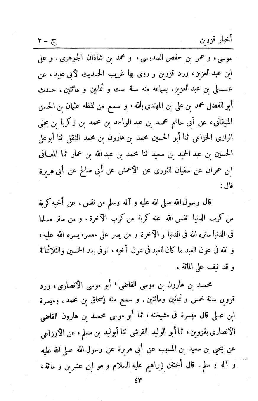 مُوسَى وعمر بْن حفص السدوسي ومحمد بْن شاذان الجوهري وعلي ابن عَبْدِ العزيز ورد قزوين وروي بها غريب الحديث لأبي عبيد عَنْ عَلِيِّ بْنِ عَبْدِ الْعَزِيزِ بسماعه منه سنة ست وثمانين ومائتين حَدَّثَ أَبُو الْفَضْلِ مُحَمَّدُ بْنُ عَلِيِّ بْنِ الْمُهْتَدِي بِاللَّهِ وَسَمِعَ مِنْ لَفْظِهِ عُثْمَانُ بْنُ الْحَسَنِ المنيقَانيُّ عَنْ أَبِي حَاتِمٍ مُحَمَّد بْن عَبْد الواحد بْن مُحَمَّد بْن زكريا بْن يحيى الرَّازِيِّ الْخُزَاعِيِّ ثنا أَبُو الْحُسَيْنِ مُحَمَّدُ بْنُ هَارُونَ بْنِ مُحَمَّدٍ الثَّقَفِيُّ ثنا أَبُو عَلِيٍّ الْحُسَيْنُ بْنُ عَبْدِ الْحَمِيدِ بْنِ سَعِيدٍ ثَنَا مُحَمَّدُ بْنُ عَبْدِ اللَّهِ بن عمار ثنا المعافي ابن عِمْرَانَ عَنْ سُفْيَانَ الثَّوْرِيِّ عَنِ الأَعْمَشِ عَنْ أَبِي صَالِحٍ عَنْ أَبِي هُرَيْرَةَ قَالَ: قَالَ رَسُولُ اللَّهِ صَلَّى اللَّهُ عَلَيْهِ وَآلِهِ وَسَلَّمَ: "مَنْ نَفَّسَ عَنْ أَخِيهِ كُرْبَةً مِنْ كُرَبِ الدُّنْيَا نَفَّسَ اللَّهُ عَنْهُ كُرْبَةً مِنْ كُرَبِ الآخِرَةِ وَمَنْ سَتَرَ مُسْلِمًا فِي الدُّنْيَا سَتَرَهُ اللَّهُ فِي الدُّنْيَا وَالآخِرَةِ وَمَنْ يَسَّرَ عَلَى مُعْسِرٍ يَسَّرَهُ اللَّهُ عَلَيْهِ وَاللَّهُ فِي عَوْنِ الْعَبْدِ مَا كَانَ الْعَبْدُ فِي عَوْنِ أَخِيهِ" توفي بعد الخمسين والثلاثمائة وقد نيف على المائة.